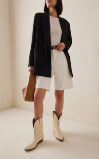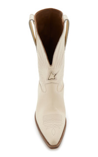Alessandro Gallo and Francesa Rinaldo are the husband and wife duo behind Golden Goose, fusing fine Italian craftsmanship with cool, contemporary style. The 'Wish Star' silhouette is a western-inspired boots with a wide, mid-calf design. This iteration is crafted from cow leather embroidered with a Western motif that alludes to the brand's star logo. PRODUCT DETAILS - Heel height measures approximately 40mm/ 1.5" - Pull on - Composition: 100% Cow Leather - Imported