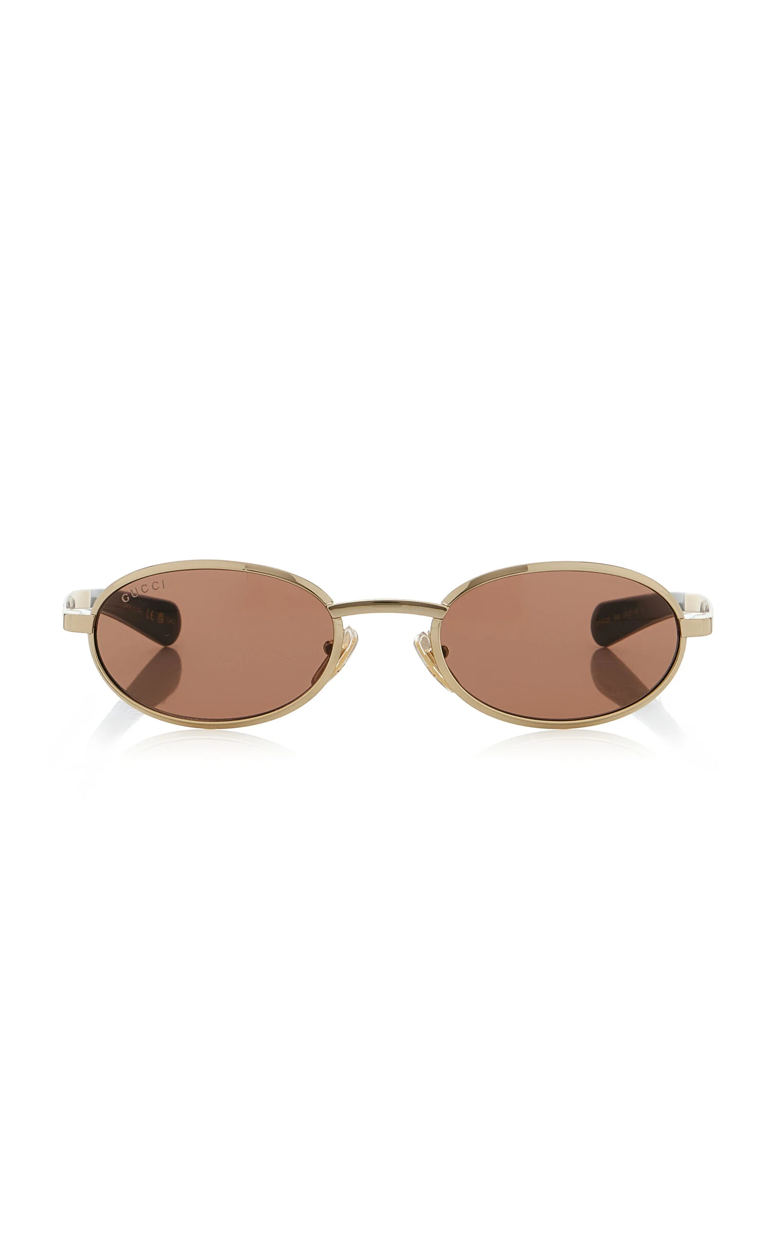 Drawing inspiration from archival elements of the House of Gucci, the newest eyewear collection is an eclectic mix of shapes and styles reminiscent of the ‘70s and ‘80s. The Pre-Fall 2025 eyewear collection blends statement silhouettes from the archives with a contemporary touch. These oval frame sunglasses feature a solid brown lens and an engraved Gucci logo across the temples. PRODUCT DETAILS - Composition: metal - 100% UVA/ UVB Protection - Made in Italy
