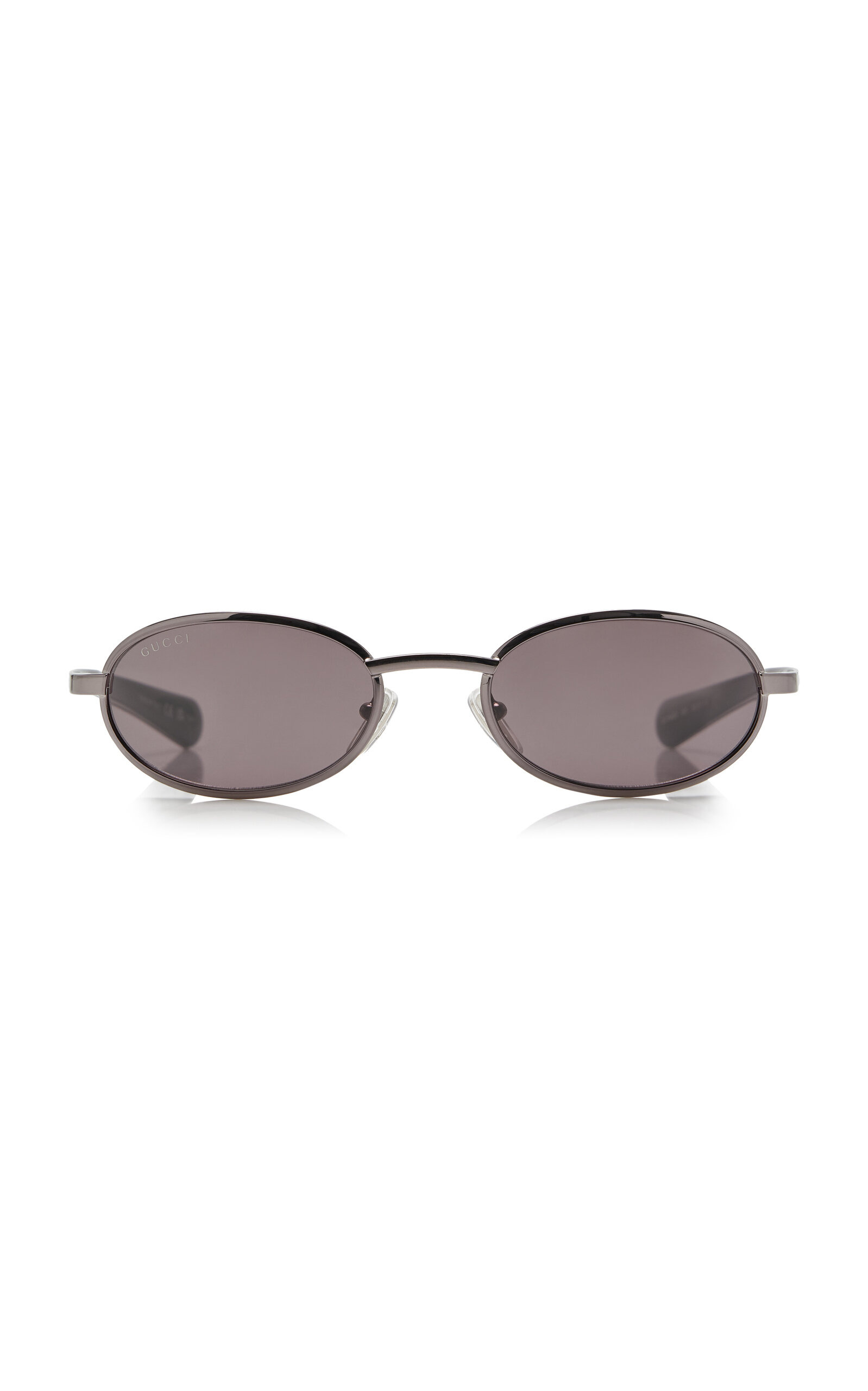 Drawing inspiration from archival elements of the House of Gucci, the newest eyewear collection is an eclectic mix of shapes and styles reminiscent of the ‘70s and ‘80s. These sunglasses have oval frames made from lightweight ruthenium metal with grey lenses and the house's moniker engraved at the temples. PRODUCT DETAILS - Composition: metal - 100% UVA/UVB protection - Made in Italy