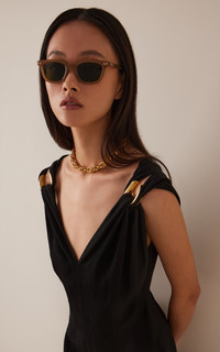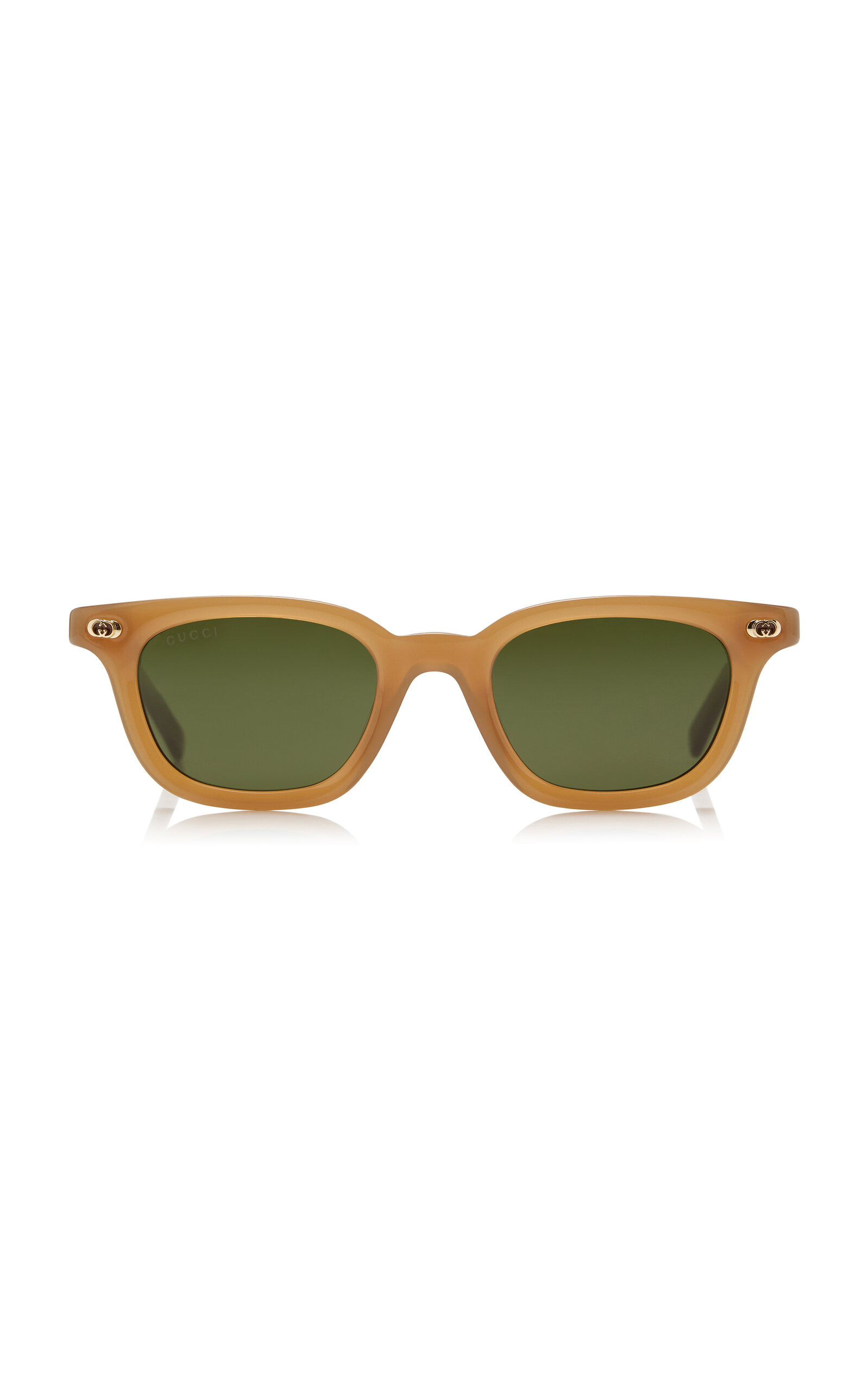 Drawing inspiration from archival elements of the House of Gucci, the newest eyewear collection is an eclectic mix of shapes and styles reminiscent of the ‘70s and ‘80s. These sunglasses have square frames made from recycled acetate with green lenses and the house's interlocking 'GG' at the temples. PRODUCT DETAILS - Composition: recycled acetate - 100% UVA/UVB protection - Made in Italy