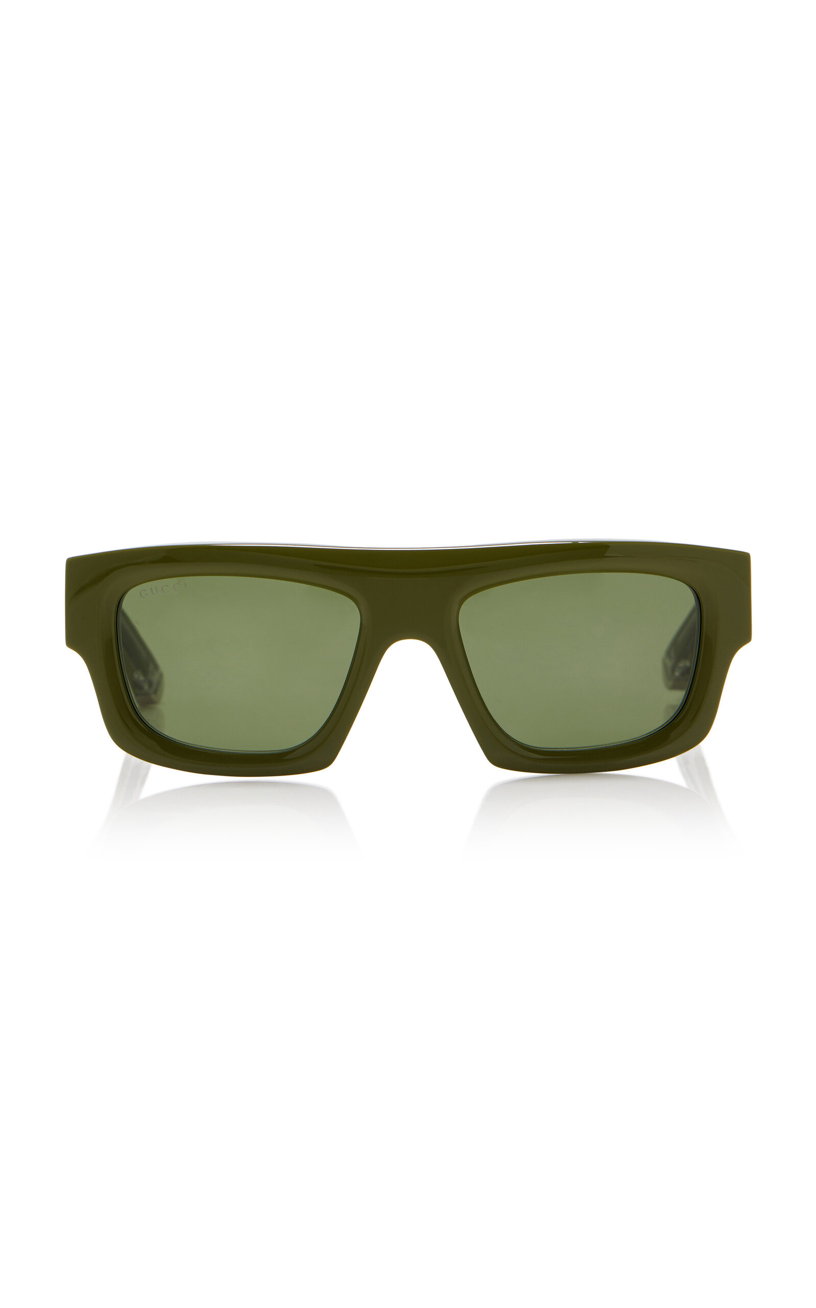 Drawing inspiration from archival elements of the House of Gucci, the newest eyewear collection is an eclectic mix of shapes and styles reminiscent of the ‘70s and ‘80s. From the Fall runway. This square-frame pair features a strong bridge and matching olive-green lenses. The internal wire core adds strength and durability. PRODUCT DETAILS - Composition: recycled acetate - 100% UVA/UVB protection - Made in Italy