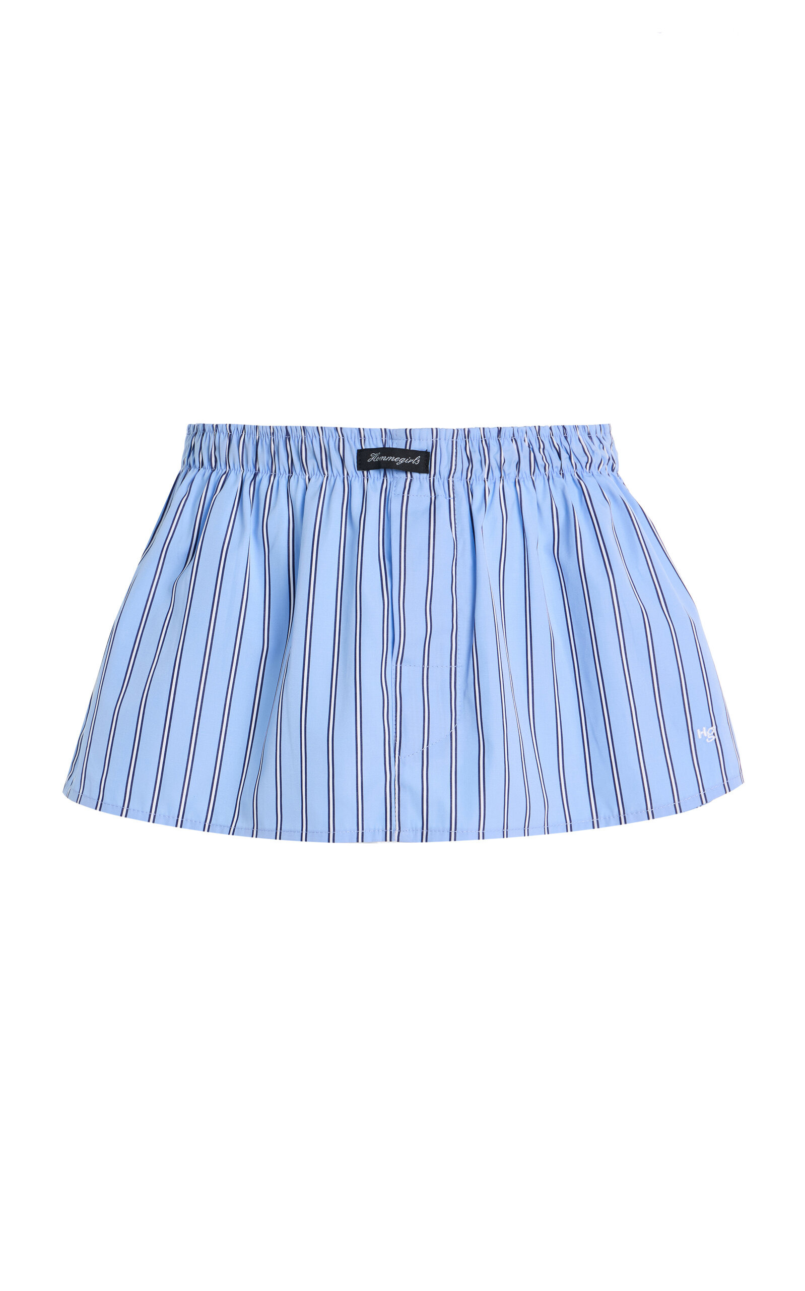 A new multi-media passion project from acclaimed designer Thakoon Panichgul, Homme Girls is dedicated to the women who shop in the men's department — where the expertly tailored clothes were designed to exude authority. Think: what would Katharine Hepburn wear today? Mini boxer skirt, can also be worn as a bandeau top. Featuring black signature logo label on waistband. Embroidered with 'Hg' monogram in navy. PRODUCT DETAILS - Spring '25 - Pull on - Composition: 100% Italian cotton - Machine wash - Made in Italy SIZE & FIT - Our model is wearing a size small - Model is 5’9.5" with a 32" bust, 24" waist, and 35.5” hip - Fits true to size, our fit specialist recommends taking your normal size