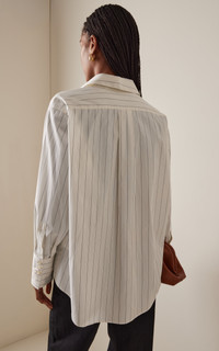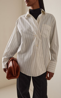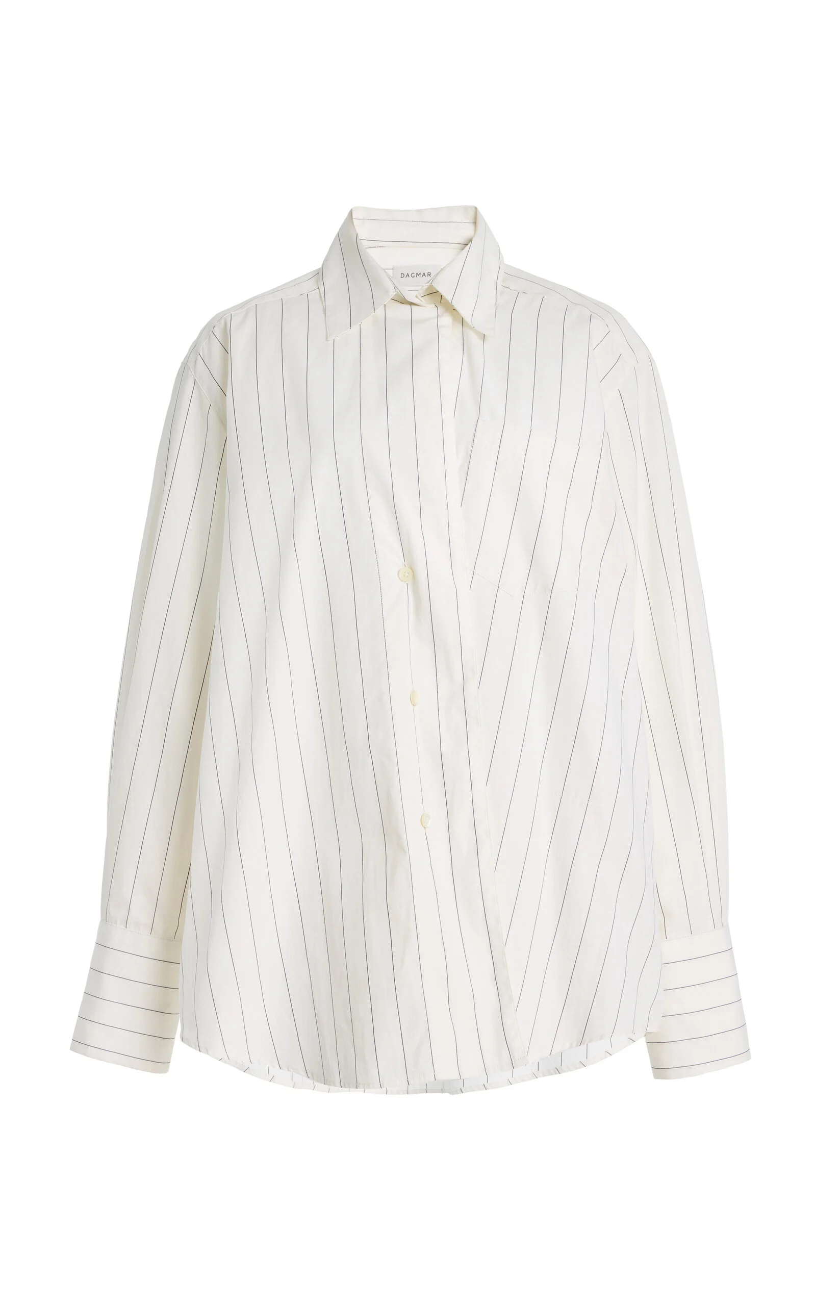 Founded in 2005 by three sisters as a way to honor their late grandmother Dagmar, this Stockholm-based label creates responsible fashion informed by its Scandinavian roots. Its collections are produced by carefully selected manufacturers using long-lasting high-quality materials with the least environmental footprint possible. Button-up shirt in crisp organic cotton poplin with a relaxed fit, asymmetric fold-over collar, and three-buttoned cuffs honoring Dagmar’s three founding sisters. Signature logo on the side. PRODUCT DETAILS - Fall '25 - Button fastening - Composition: 100% organic cotton - Dry clean - Made in Portugal SIZE & FIT - Our model is wearing a size 34 - Model is 5'10" with a 30" bust, 24" waist, and 34" hip - Fits true to size, our fit specialist recommends taking your normal size