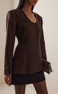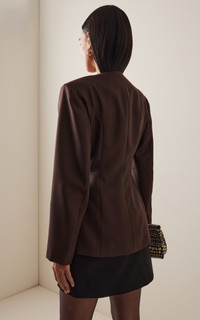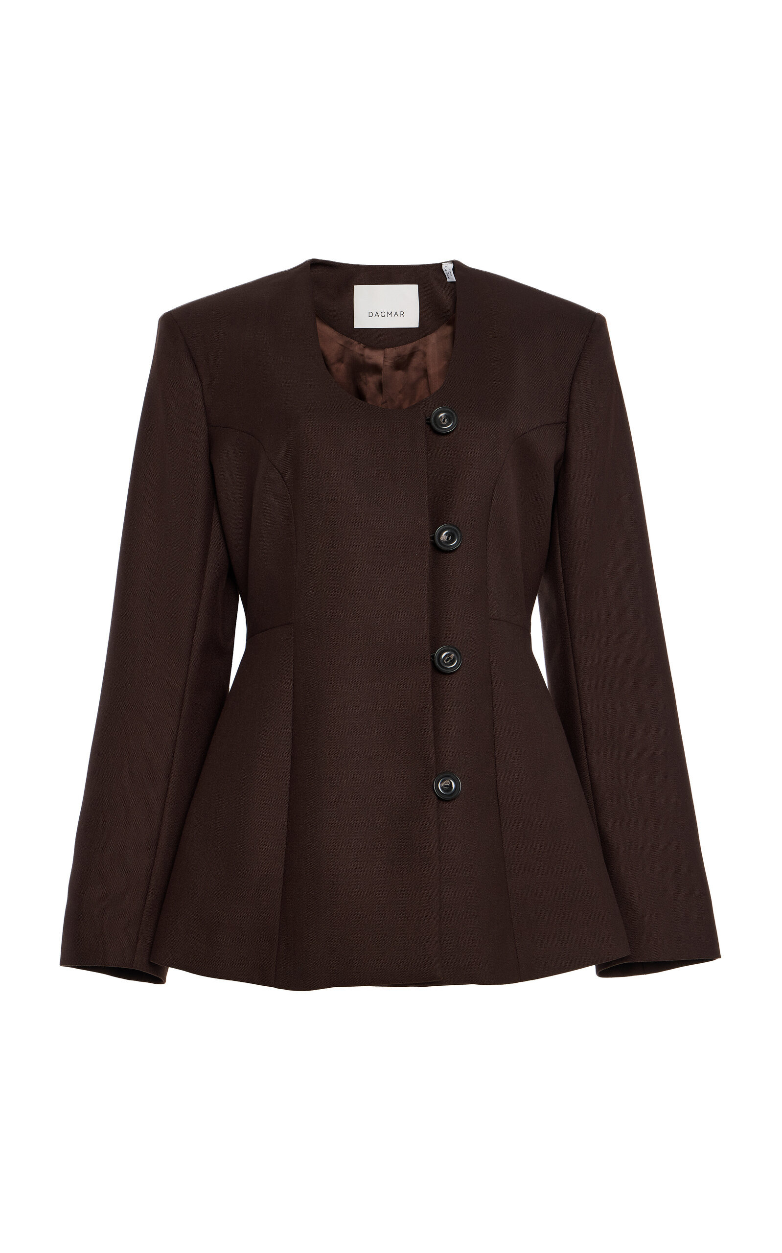 Founded in 2005 by three sisters as a way to honor their late grandmother Dagmar, this Stockholm-based label creates responsible fashion informed by its Scandinavian roots. Its collections are produced by carefully selected manufacturers using long-lasting high-quality materials with the least environmental footprint possible. Imagined in a wool blend suit fabric, the Collarless Blazer is a study in dynamically balanced proportions. Fully lined, this modern take on a classic silhouette is presented with a fitted waistline, accenting buttons, and softly tailored shoulders. PRODUCT DETAILS - Fall '25 - Button fastening - Composition: 55% polyester, 45% wool - Designer color: Chocolate - Dry clean - Made in Portugal