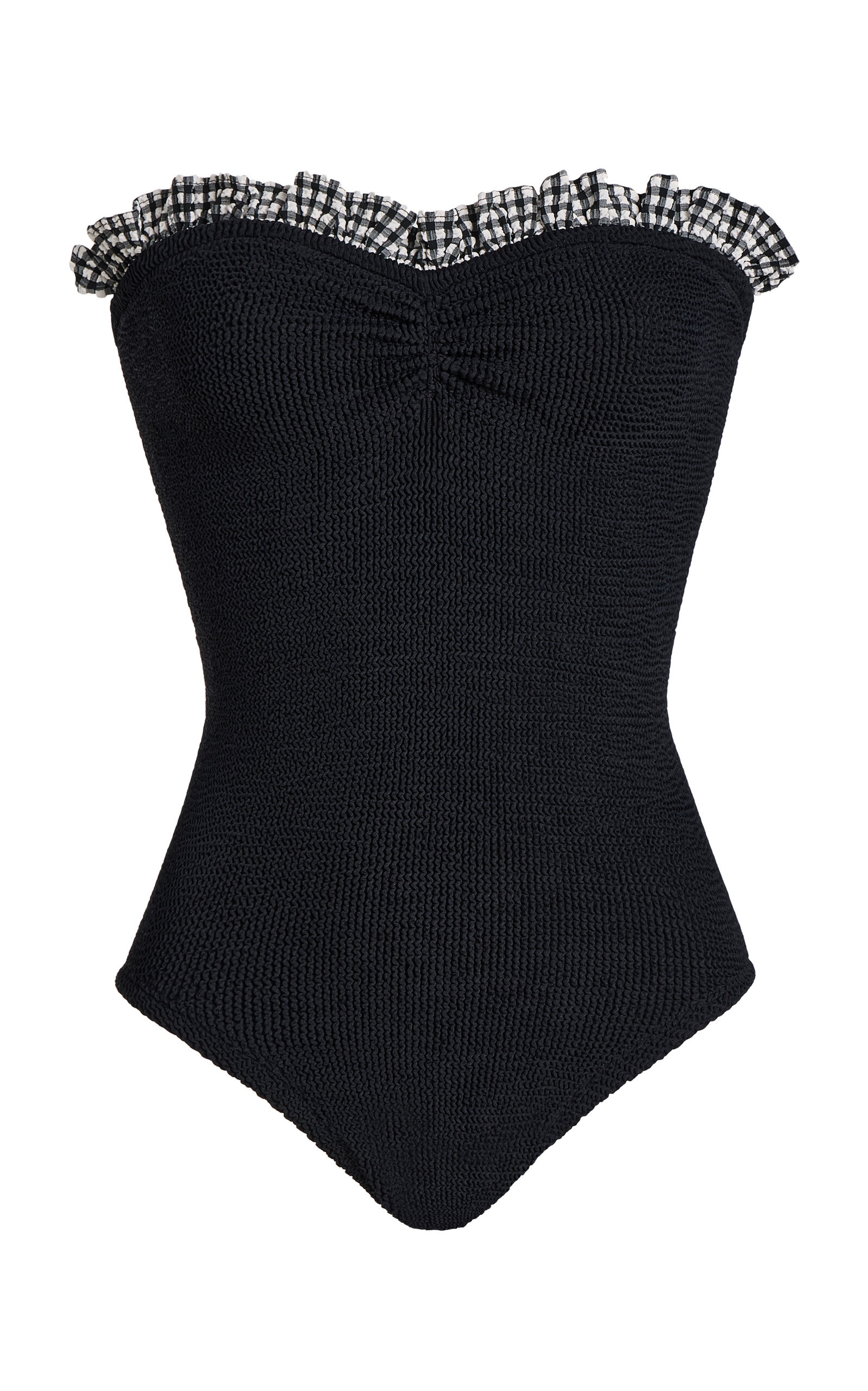 Dolly strapless ruffled gingham-trimmed seersucker swimsuit Black