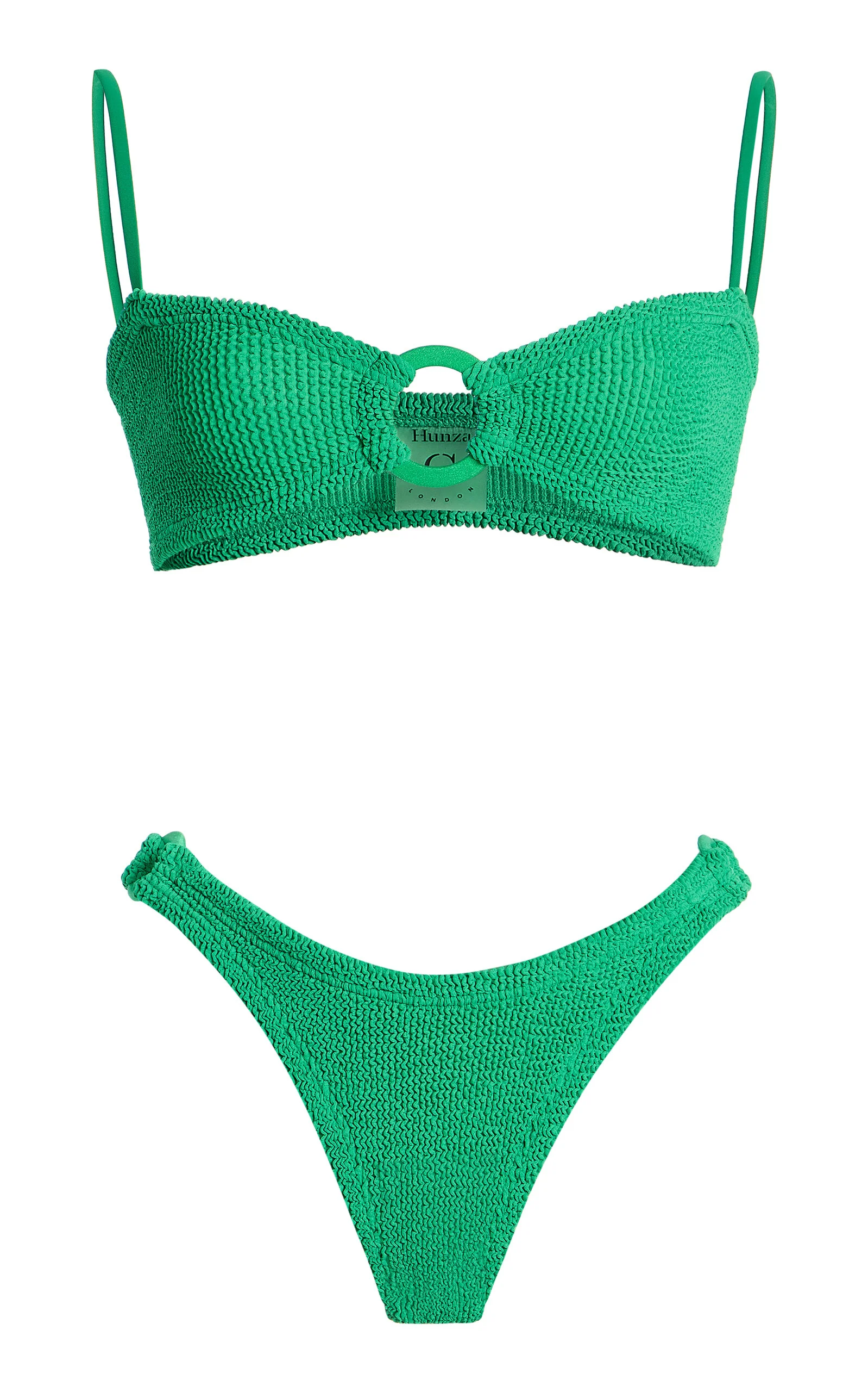 Hunza G first found fame in the '90s for the cutout mini worn by Julia Roberts in Pretty Woman — it became a must-have for women everywhere. Now under the direction of Georgiana Huddart, the London-based label is having a major moment with their swimsuits and bikinis sustainably made from signature seersucker. The ‘Misty’ bikini nods to the 70s with tonal hoop detailing across the top and bottom. Crafted from Hunza G’s signature seersucker, it features a bandeau-style top with thin straps and classic low-rise bottoms. PRODUCT DETAILS - Resort '26 - Slip on - Composition: 97% Polyamide 3% Elastane - Designer color: Emerald - Hand wash - Imported SIZE & FIT - Our model is 5'10" with a 30" bust, 24" waist, and 34" hip - One size. This style comfortably fits those who are between a US 2-12