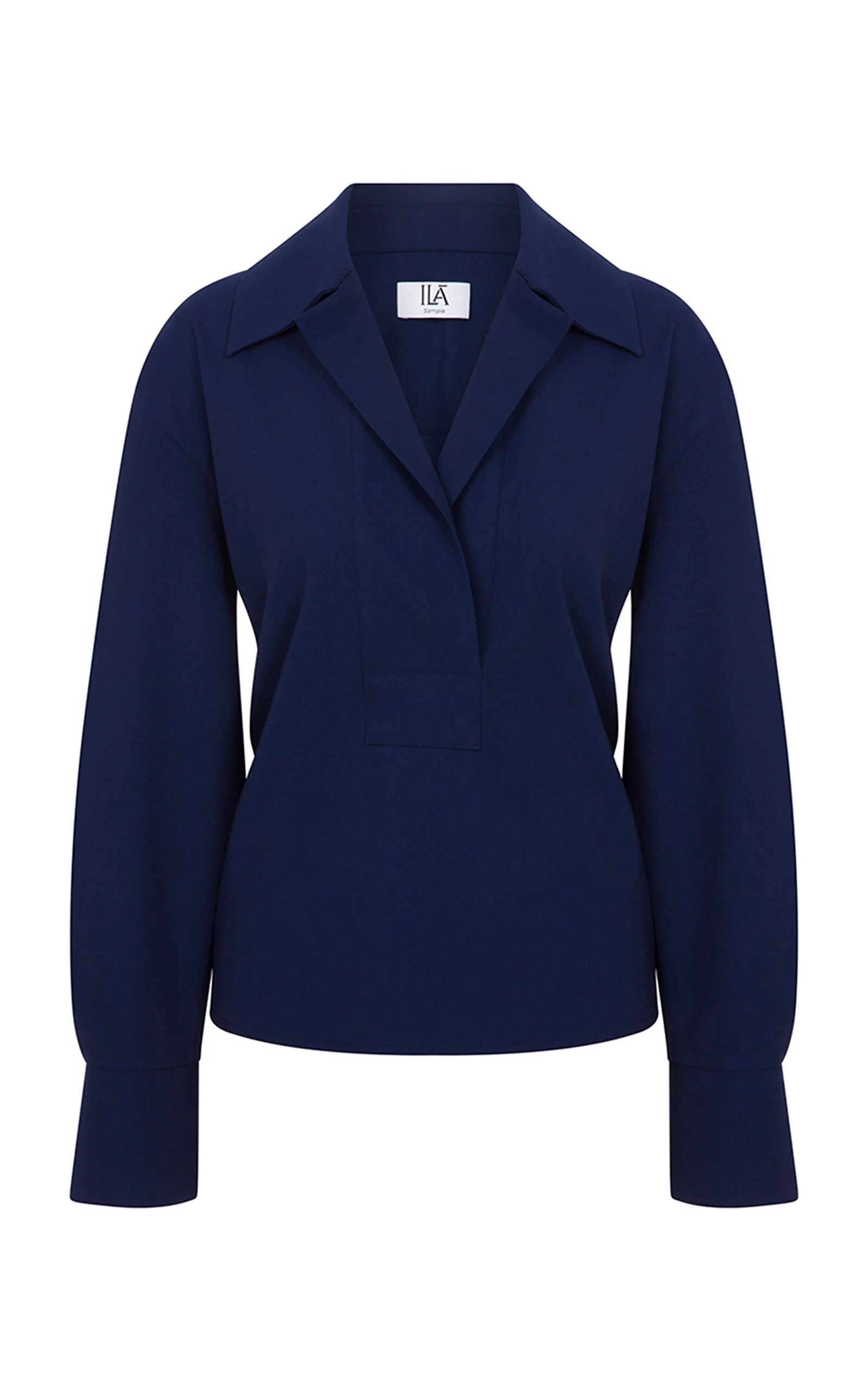 PRODUCT DETAILS - Oversized fit, standard collar and long sleeves - Front Button Closure - Composition: 67% POLYESTER 25% VISCOSE 8% ELASTANE - Color: NAVY - Dry Clean Only - Resort '26