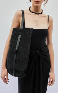 Each Janessa Leone accessory is expertly hand-crafted in Los Angeles with responsibly-sourced materials and ethical practice—prioritizing people and planet above all. Tanner is a signature tote bag meticulously crafted from durable raffia straw, featuring black regenerative leather straps for practical hat holding capabilities. PRODUCT DETAILS - This item is not eligible for expedited shipping - Open top - Composition: raffia straw, regenerative leather - Imported SIZE & FIT - This item measures 42 x 50cm