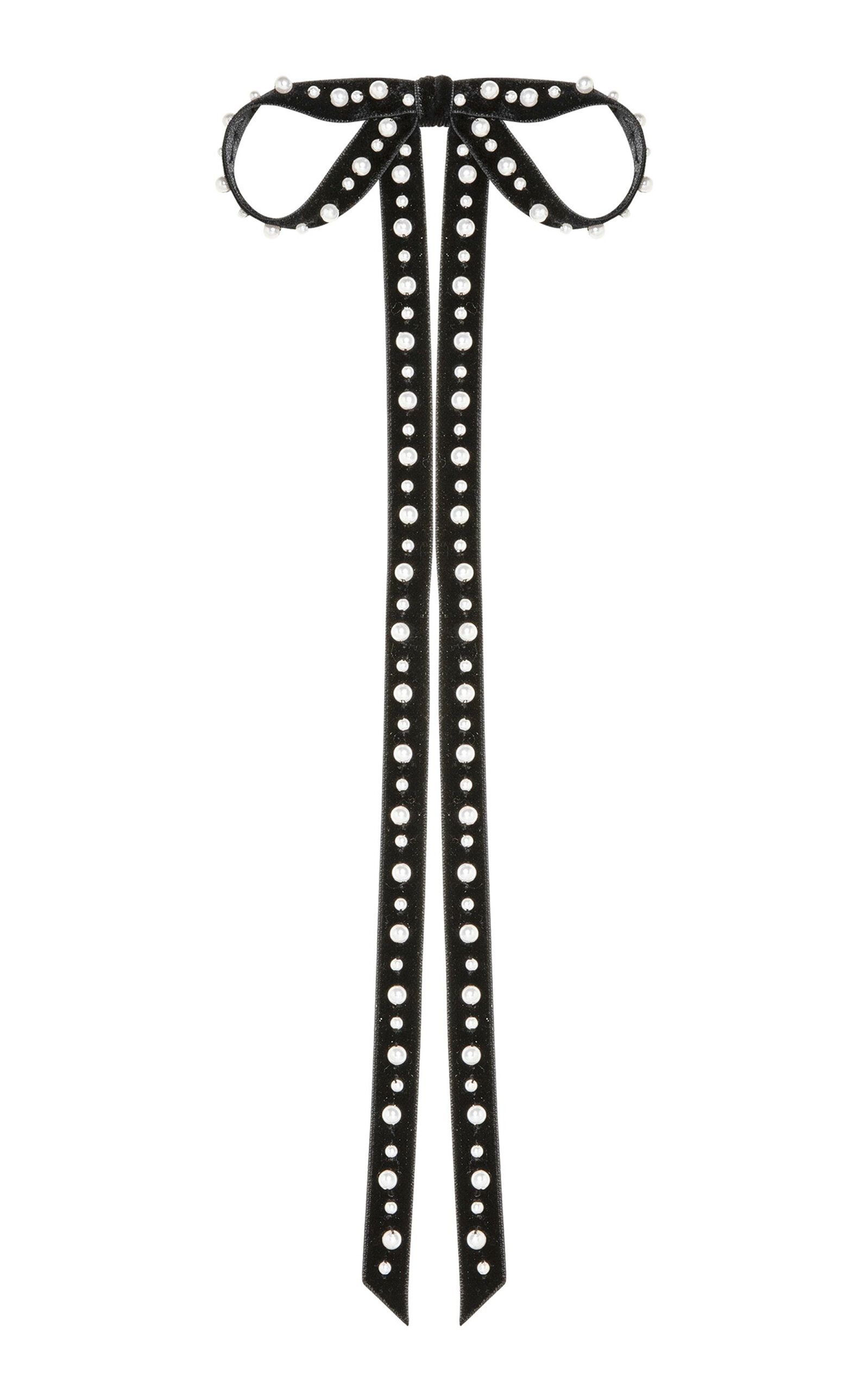 Jennifer Behr launched her eponymous label in 2005 with a distinctive range of luxury hair accessories and jewelry designs. Each piece is carefully crafted and made to carry on the rich inspiration, tradition and powerful histories of bygone eras. The 'Annalee' barrette has a distinctly whimsical appeal, featuring embroidered pearls in a playfully exaggerated bow. Crafted from silk velvet, the bow's extra-long tails ripple through the hair like streamers. The bow is finished with an automatic French barrette closure, for easy placement in any style. PRODUCT DETAILS - Not eligible for expedited shipping - Composition: velvet - Made in the USA