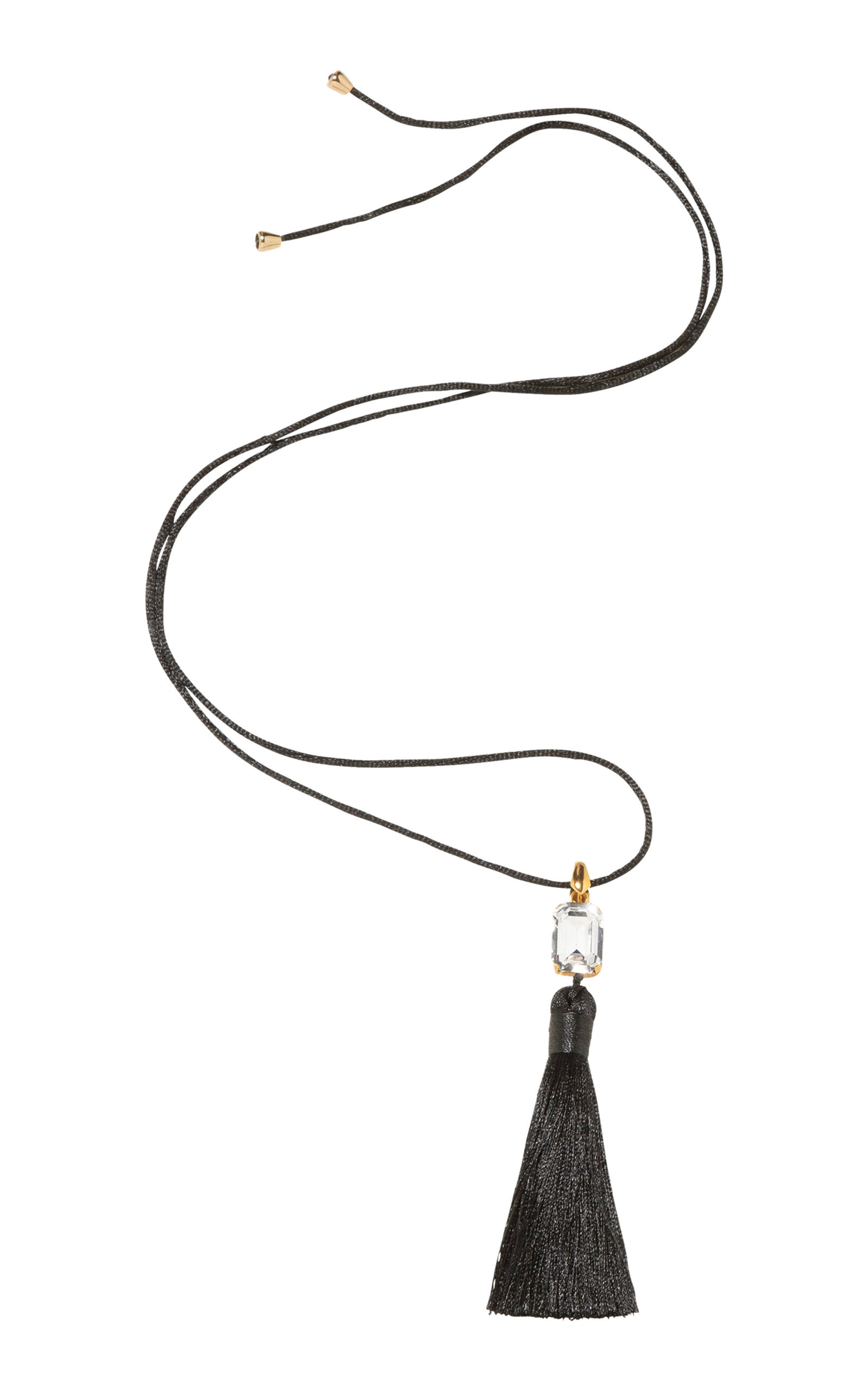 Jennifer Behr launched her eponymous label in 2005 with a distinctive range of luxury hair accessories and jewelry designs. Each piece is carefully crafted and made to carry on the rich inspiration, tradition and powerful histories of bygone eras. The Francine Necklace is a transformative finishing touch that sweeps any look up in its vintage-inspired allure. Made by hand in New York, the satin tassel is suspended from a single emerald-cut Austrian crystal, with 18-karat gold-plated finishings. The silk cord it sits on is fully adjustable to achieve a custom length. PRODUCT DETAILS - Composition: crystal; silk - Made in the USA