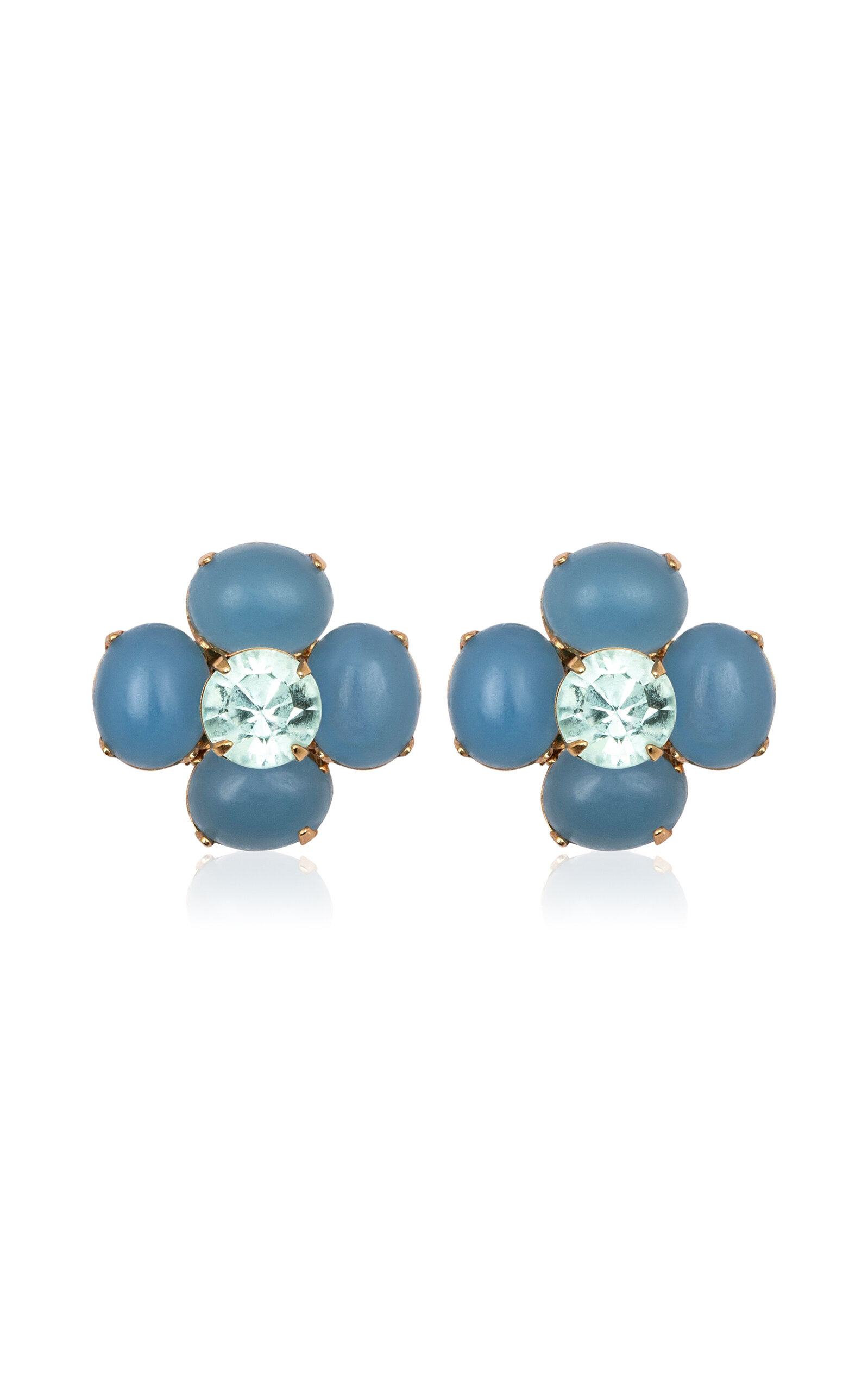 Jennifer Behr launched her eponymous label in 2005 with a distinctive range of luxury hair accessories and jewelry designs. Each piece is carefully crafted and made to carry on the rich inspiration, tradition and powerful histories of bygone eras. Inspired by 1960s mod florals, the Quinn Earrings are a delicious pop of color, flaunting the vivid hues of semi-precious stones like pink opal, blue agate, and red garnet. Made by hand in New York, the bubble-flower shape is achieved using cabochon gemstones for petals, with a fine Austrian crystal in the center. The stud is complete with an 18-karat gold-plated setting. PRODUCT DETAILS - Composition: pink opal, blue agate, and red garnet - Made in the USA