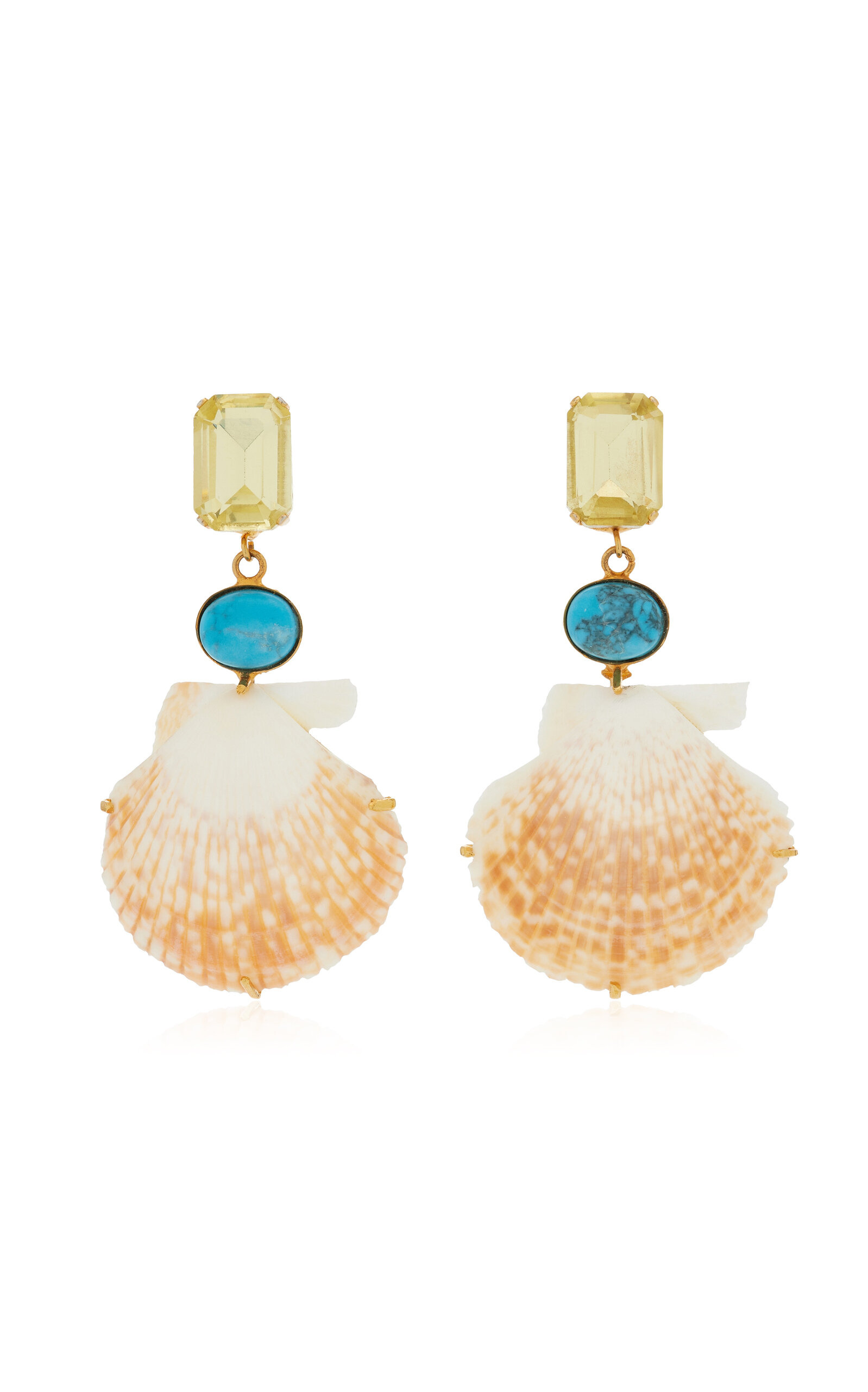 Jennifer Behr launched her eponymous label in 2005 with a distinctive range of luxury hair accessories and jewelry designs. Each piece is carefully crafted and made to carry on the rich inspiration, tradition and powerful histories of bygone eras. PRODUCT DETAILS - Post fastening for pierced ears - Composition: scallop seashell, turquoise, glass crystal, 14k gold plated brass - Made in the USA SIZE & FIT - Length measures 2.5"