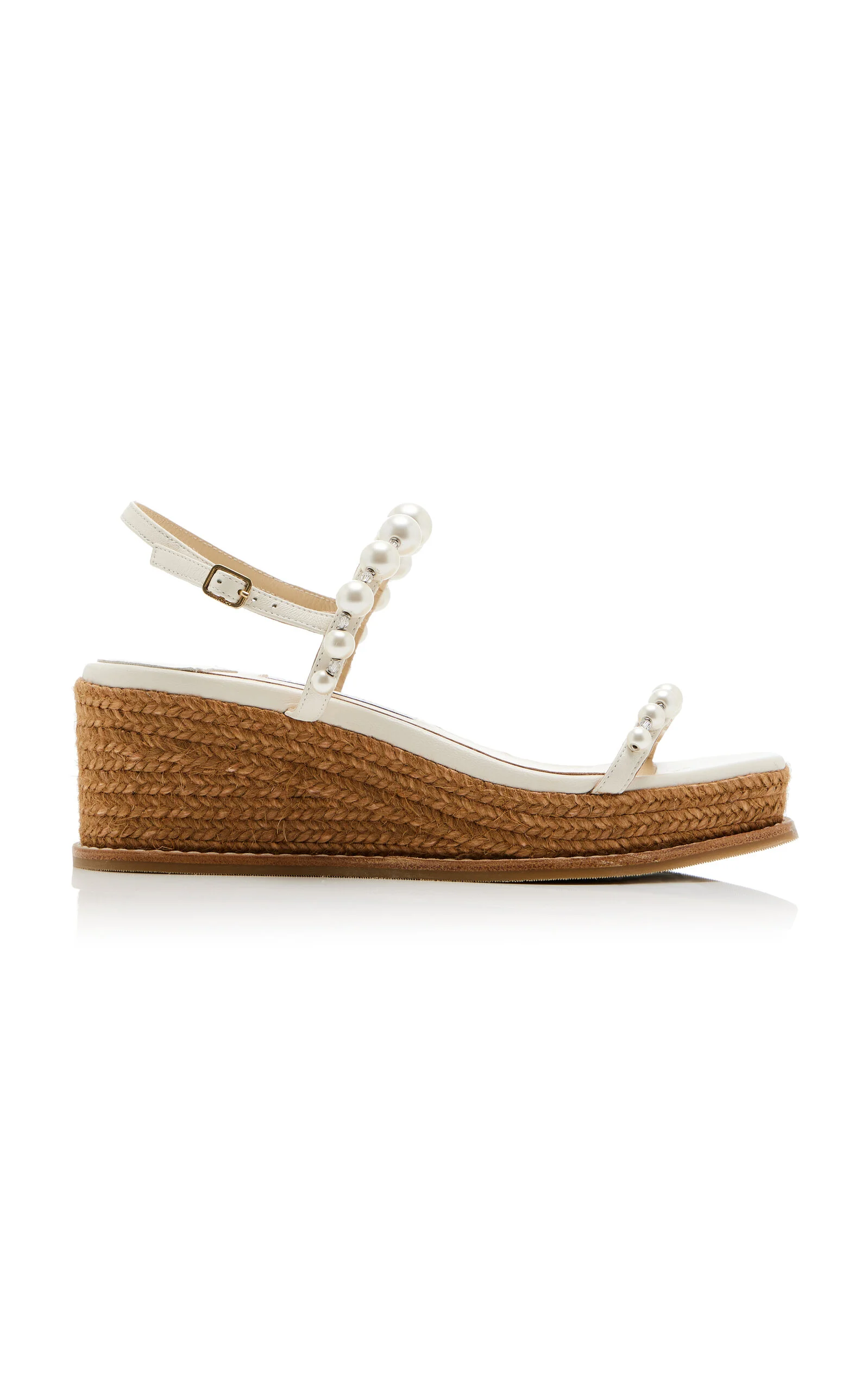Loved by everyone from mega-celebrities to first ladies and royalty, Jimmy Choo's faultless roster of shoes and accessories have graced countless red carpets and glamorous events. The 'Amatuus' wedge sandals bring effortless glamour to your weekend or vacation capsule. Crafted from smooth nappa leather, they’re complemented by a signature pearl and crystal embellishment with an adjustable ankle strap. PRODUCT DETAILS - Heel height measures 60mm/ 2.35" - Buckle fastening - Composition: nappa leather, pearls - Designer color: Latte/ White - Made in Italy