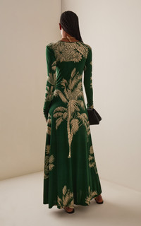 PRODUCT DETAILS - Slim fit, deep V neckline and long sleeve, tropical printed detailing throughout, A-line silhouette maxi - Slip On - Unlined - Composition: 96% Viscose, 4% Elastane - Color: green - Dry Clean Only - Fall-Winter '25