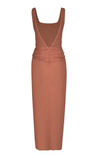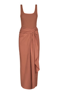 PRODUCT DETAILS - Regular fit, scoop neck line with thick straps, ruffled waist with wrap detail, asymmetric hem maxi dress - Slip-On - Unlined - Composition: 80% Linen, 17.5% Recycled Polyamide, 2.5% Elastane - Color: tan - Dry Clean Only - Pre-Fall 25'