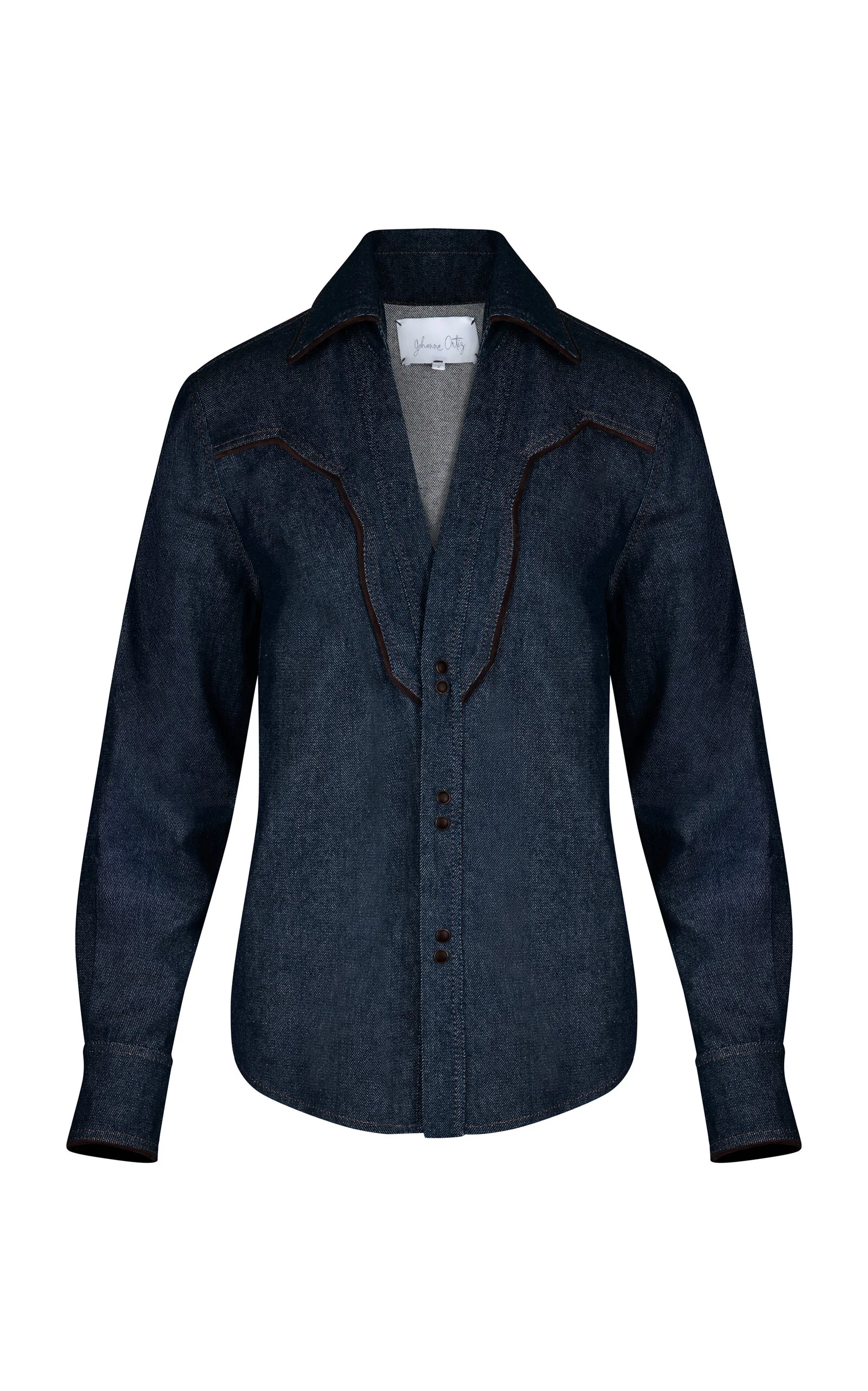 PRODUCT DETAILS - Regular fit, standard collar and long sleeve - Front Button Closure - Unlined - Composition: 100% Cotton - Color: navy - Dry Clean Only - Fall-Winter '25