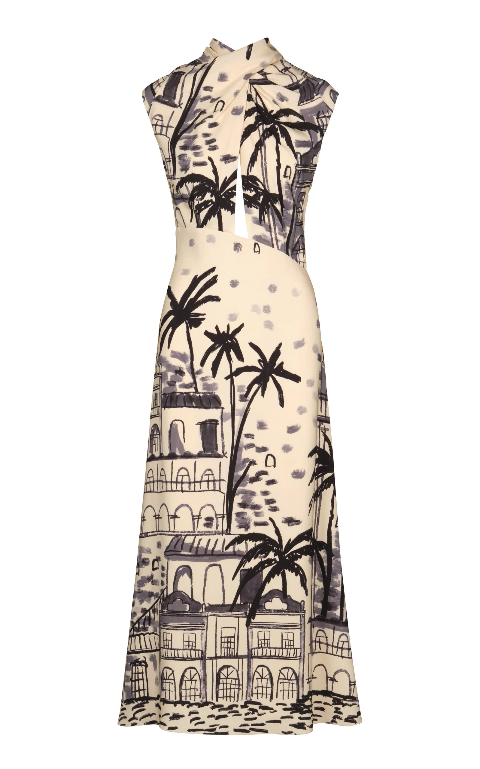 A sense of free-flowing abundance defines the Resort lineup from the Colombian designer, who calls the color palette for this collection “warm, moody, and unforgettable.” 'Interdimensional' dress in silk crepe de chine has an A-line silhouette with a wrap-effect bodice that creates a front slit opening. PRODUCT DETAILS - Resort '26 - Zip fastening along back - Composition: 100% silk - Designer color: Black/ Ecru - Dry clean - Made in Colombia SIZE & FIT - Our model is wearing a size US 2 - Model is 5'10" with a 31" bust, 23.5" waist, and 33.5" hip