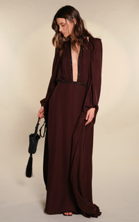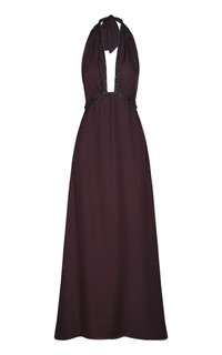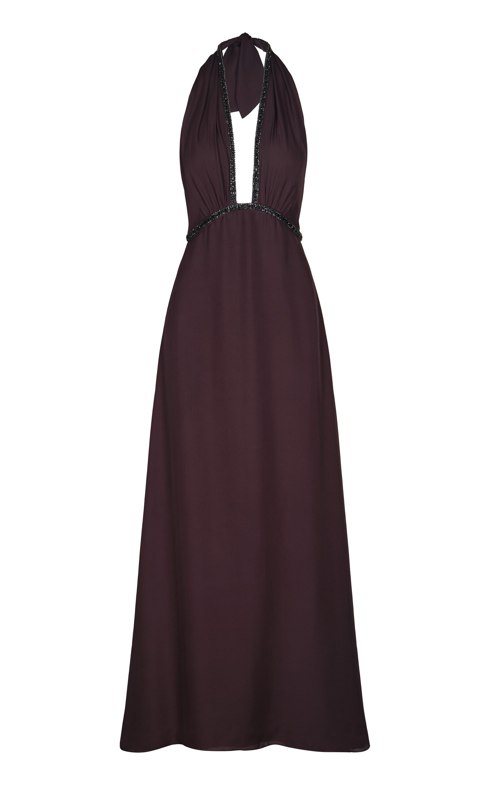 PRODUCT DETAILS - Regular fit, open torso detail with thick straps, embroidered lining, with scarf, maxi dress - Zip Fastening - Unlined - Composition: 100% Silk - Color: brown - Dry Clean Only - Pre-Fall 25'