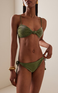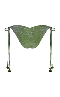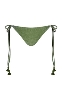 PRODUCT DETAILS - Adjustable side ties, minimal coverage, can be worn high or low on hips - Tie fastening at sides - Lined - Composition: 66% Recycled Polyamide, 26% Metallic Silver, 8% Elastane - Color: Maguey Green - Hand wash - Pre-Fall '25