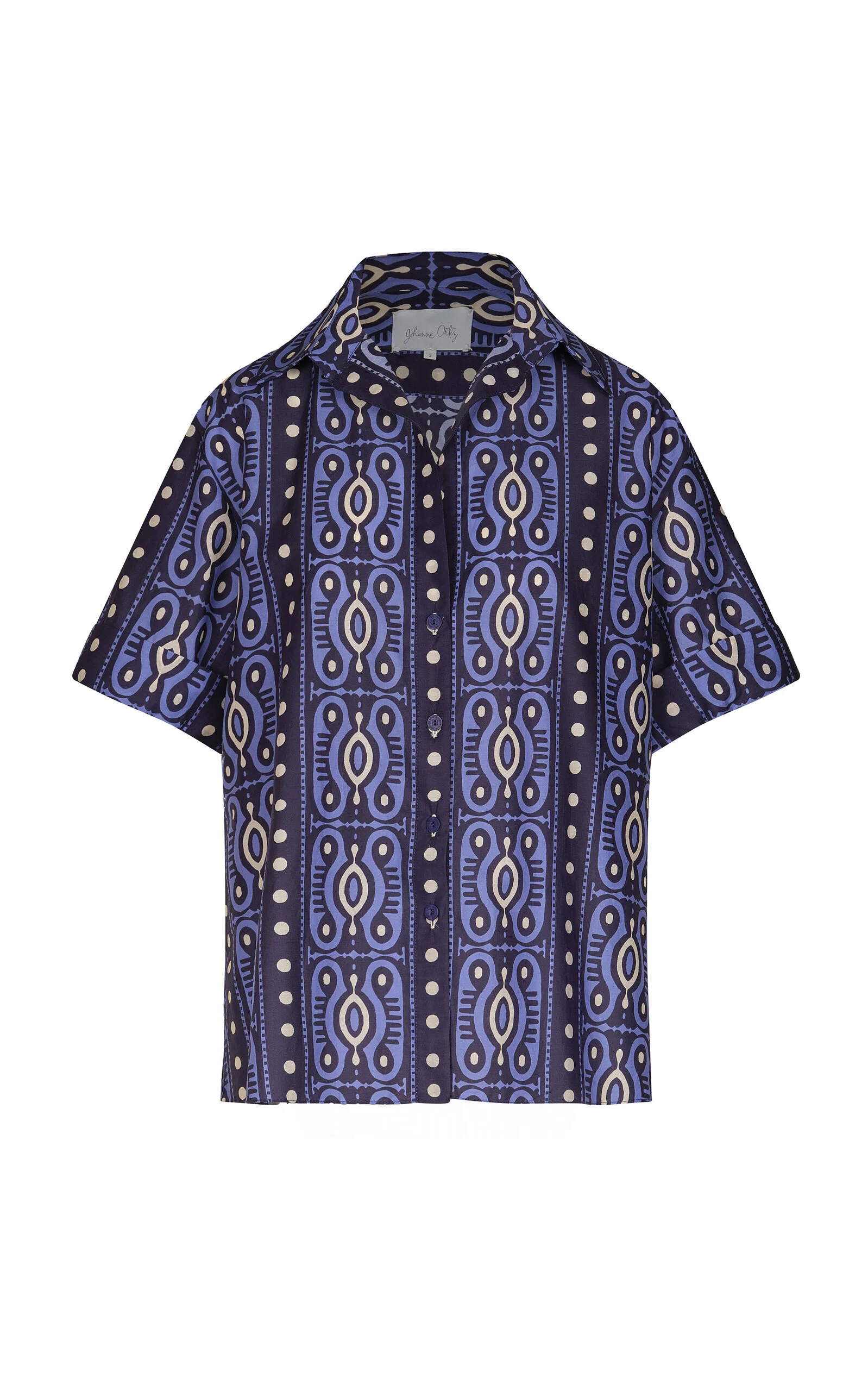 A sense of free-flowing abundance defines the Resort lineup from the Colombian designer, who calls the color palette for this collection “warm, moody, and unforgettable.” 'Salty Promises' shirt has a relaxed fit made from cotton poplin with a custom print. Pair it with the Hunting Roots skirt. PRODUCT DETAILS - Resort '26 - Button fastening - Composition: 100% cotton - Designer color: Navy/ Ecru - Hand wash - Made in Colombia SIZE & FIT - Our model is wearing a size US 2 - Model is 5'11" with a 30" bust, 24" waist, and 24" hip
