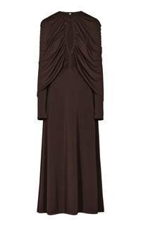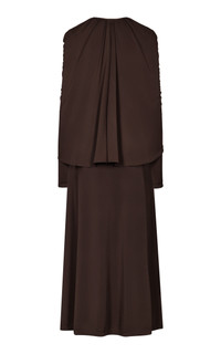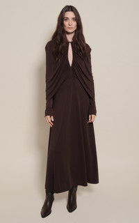 PRODUCT DETAILS - Regular fit, key hole cutout detail by the chest, with draped detailing by the shoulders, with fringed by the cuff sleeves, A-line silhouette maxi - Hook And Eye Closure - Unlined - Composition: 94% Viscose, 6% Elastane - Color: brown - Dry Clean Only - Fall-Winter '25