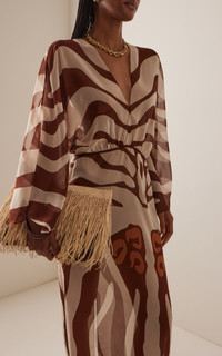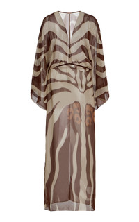 PRODUCT DETAILS - Loose bell sleeves, semi-sheer, blouson bodice with plunged neck, maxi hem - Slip on - Unlined - Composition: 100% Recycled Polyester - Color: Dark Mocca/Ecru - Dry clean only - Pre-Fall '25