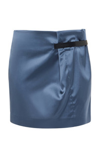 Known for his idiosyncratic contradictions in design, Jonathan Anderson masterfully imbues opposing sensibilities into every one of his luxe garments. This mini skirt is cut from lustrous satin that gathers at the hip with a leather tab. PRODUCT DETAILS - Pre-Fall '25 - Zip fastening at side - Composition: 75% acetate, 22% polyamide, 3% elastane; Tab: leather - Designer color: Steel Blue - Dry clean - Made in Portugal