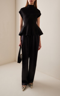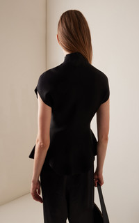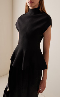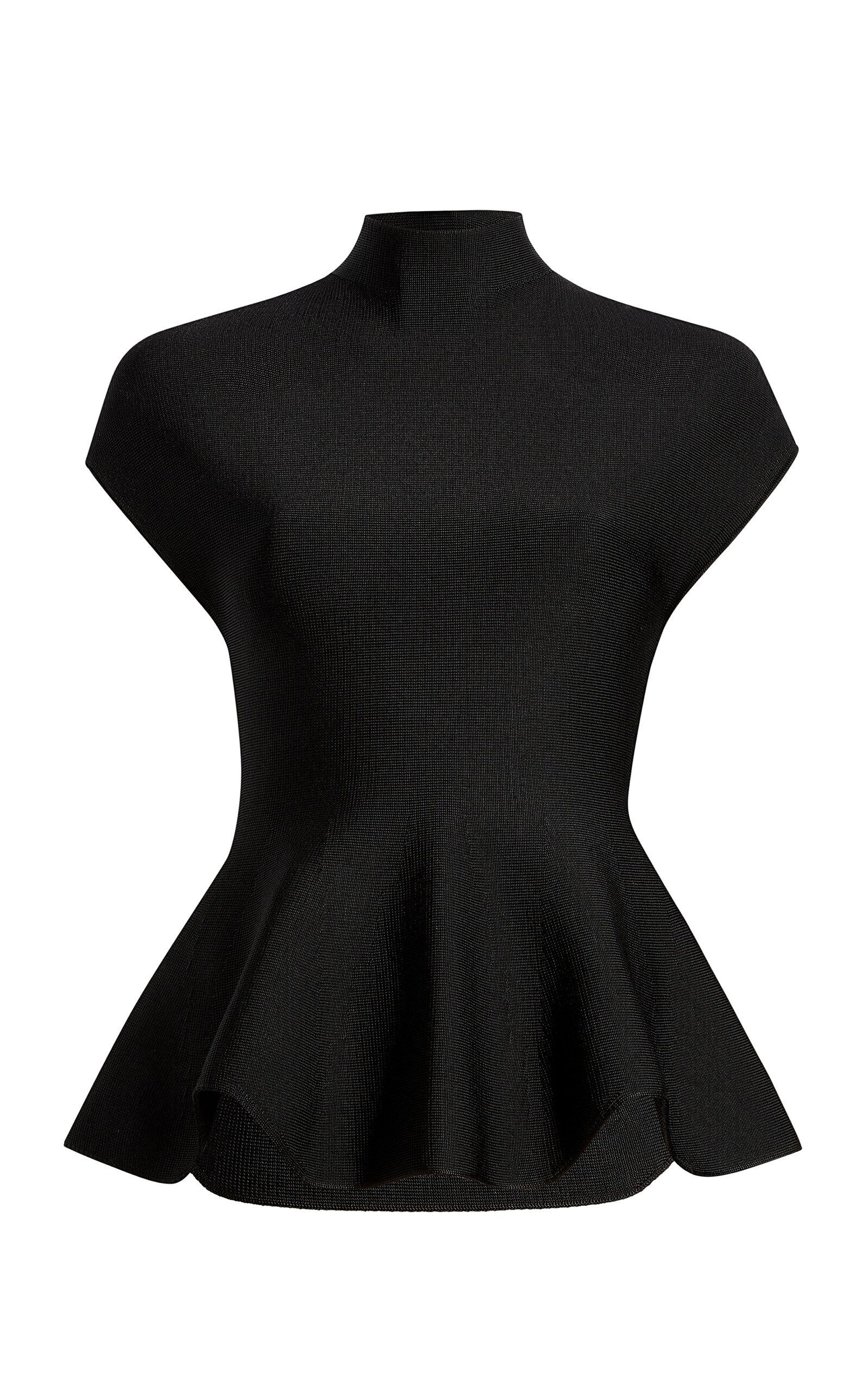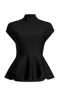 PRODUCT DETAILS - Mock neck, short sleeve, peplum design, slim fit - Slip on - Unlined - Composition: 97% Wool, 2% Polyamide, 1% Polyurethane - Color: Glaze - Dry clean only - Spring/Summer '25