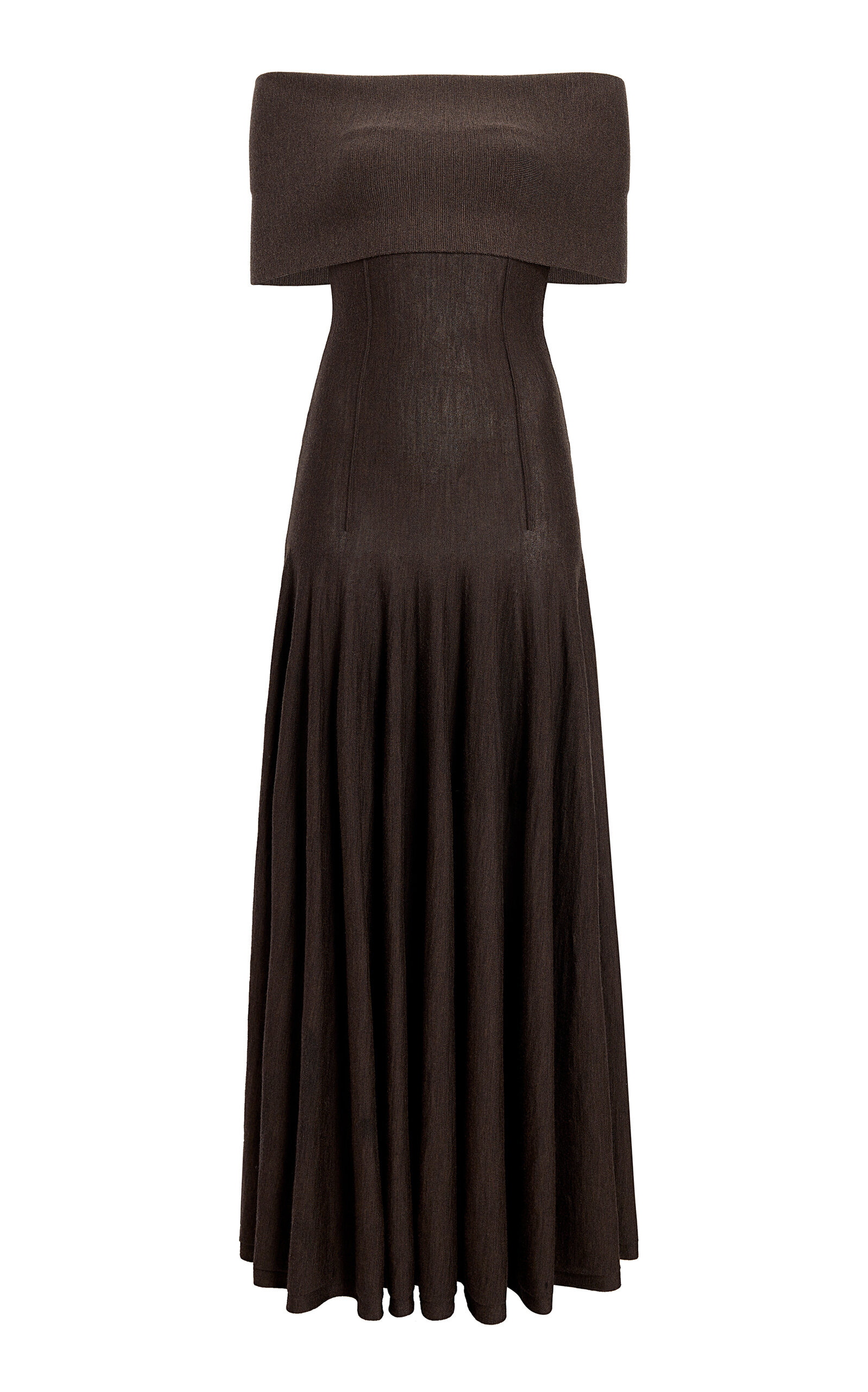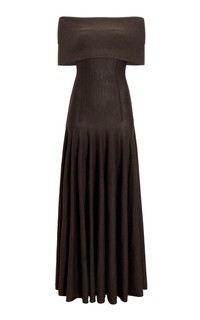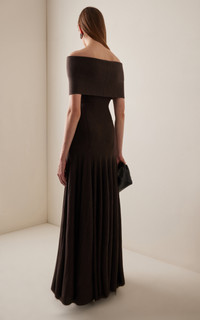 Ava off-the-shoulder pleated wool-blend maxi dress Dark brown