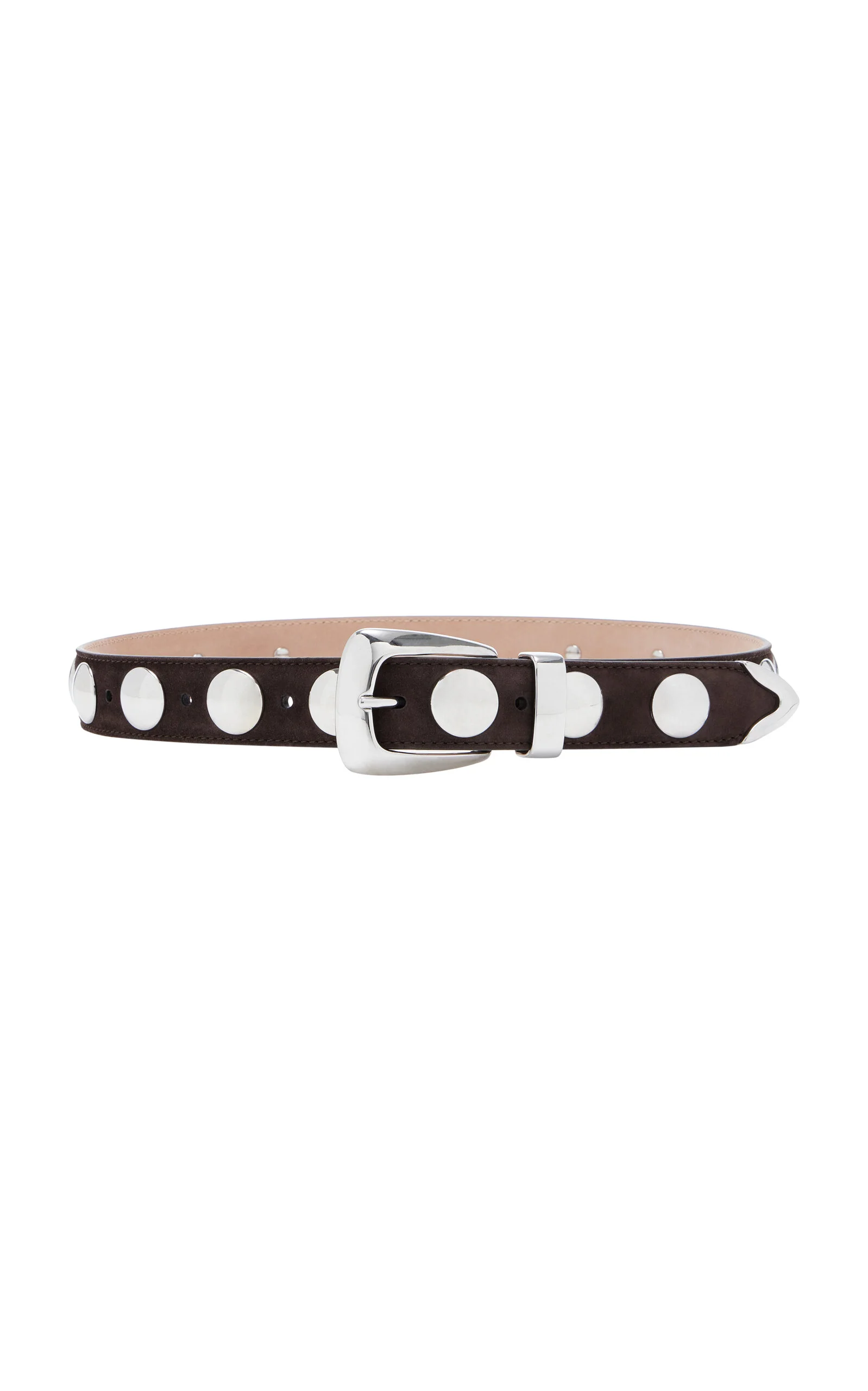 The New York-based label’s genius has always been its ability to craft beautiful pieces that are refreshingly real yet still evoke a sense of emotion. Crafted in Italy from buttery suede, the 'Benny' belt is accented with gleaming, jewelry-like hardware: polished silver-toned discs paired with a brushed buckle, loop, and tip. PRODUCT DETAILS - Buckle fastening - Composition: calfskin leather - Designer color: Coffee - Made in Italy SIZE & FIT - This item measures approximately 30mm in width