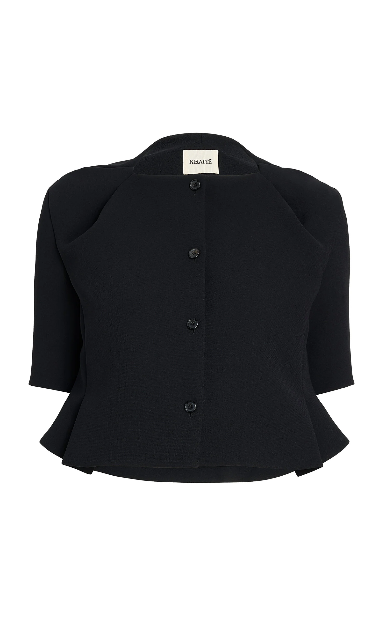 For Spring '26, Cate Holstein delivers pure New York City energy in a multitude of expressions that coalesce into a singularly fluid wardrobe. Tailored from double-faced crepe, the 'Franc' jacket has a sculptural design created by strategically placed pleats and folds along the neck and sides. PRODUCT DETAILS - Spring '26 - Button fastenings through front - Composition: 100% Polyester - Dry clean only - Made in Italy SIZE & FIT - Our model is wearing a size US 2 - Our model is 5'11" with a 30" bust, 24" waist, and 34" hip