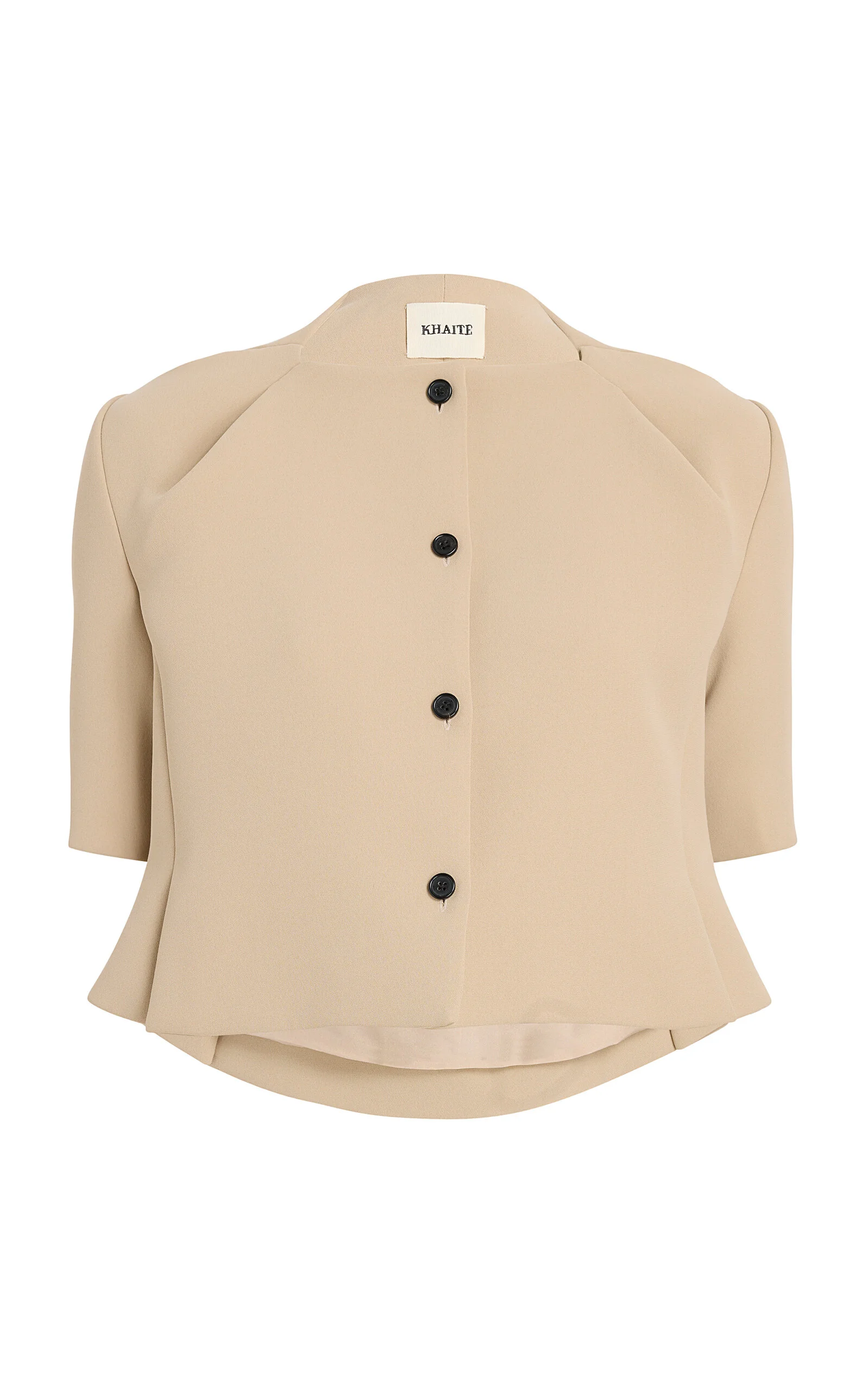 For Spring '26, Cate Holstein delivers pure New York City energy in a multitude of expressions that coalesce into a singularly fluid wardrobe. Tailored from double-faced crepe, the 'Franc' jacket has a sculptural design created by strategically placed pleats and folds along the neck and sides. PRODUCT DETAILS - Spring '26 - Button fastenings through front - Composition: 100% Polyester - Dry clean only - Made in Italy SIZE & FIT - Our model is wearing a size US 2 - Our model is 5'11" with a 30" bust, 24" waist, and 34" hip