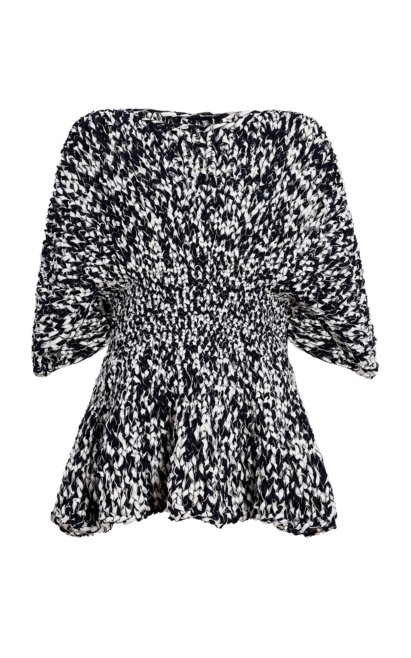 PRODUCT DETAILS - Textured knit, peplum shape, dolman short sleeve, cinched waist - Slip on - Unlined - Composition: 78% Cotton, 22% Polyamide - Color: Glaze / Midnight Navy - Dry clean only - Spring/Summer '25
