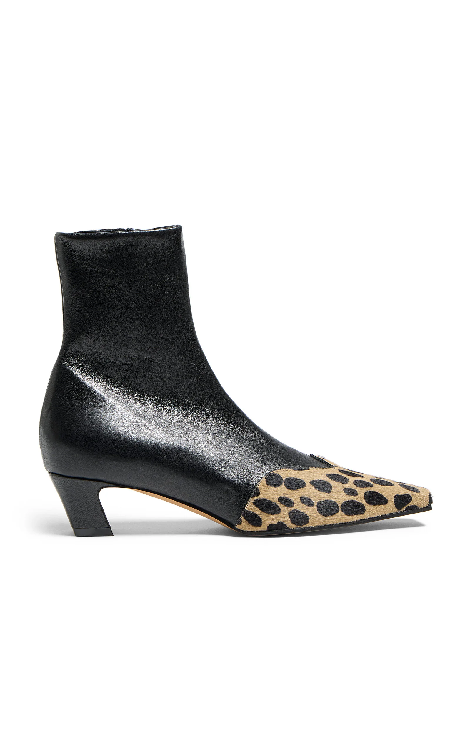 PRODUCT DETAILS - Ankle boots silhouette, leather body, haircalf detail, pointed toe - Composition: upper: 80% lambskin 20% calfskin sole: 100% calfskin - Made in Italy SIZE & FIT - Heel height measures 40 mm