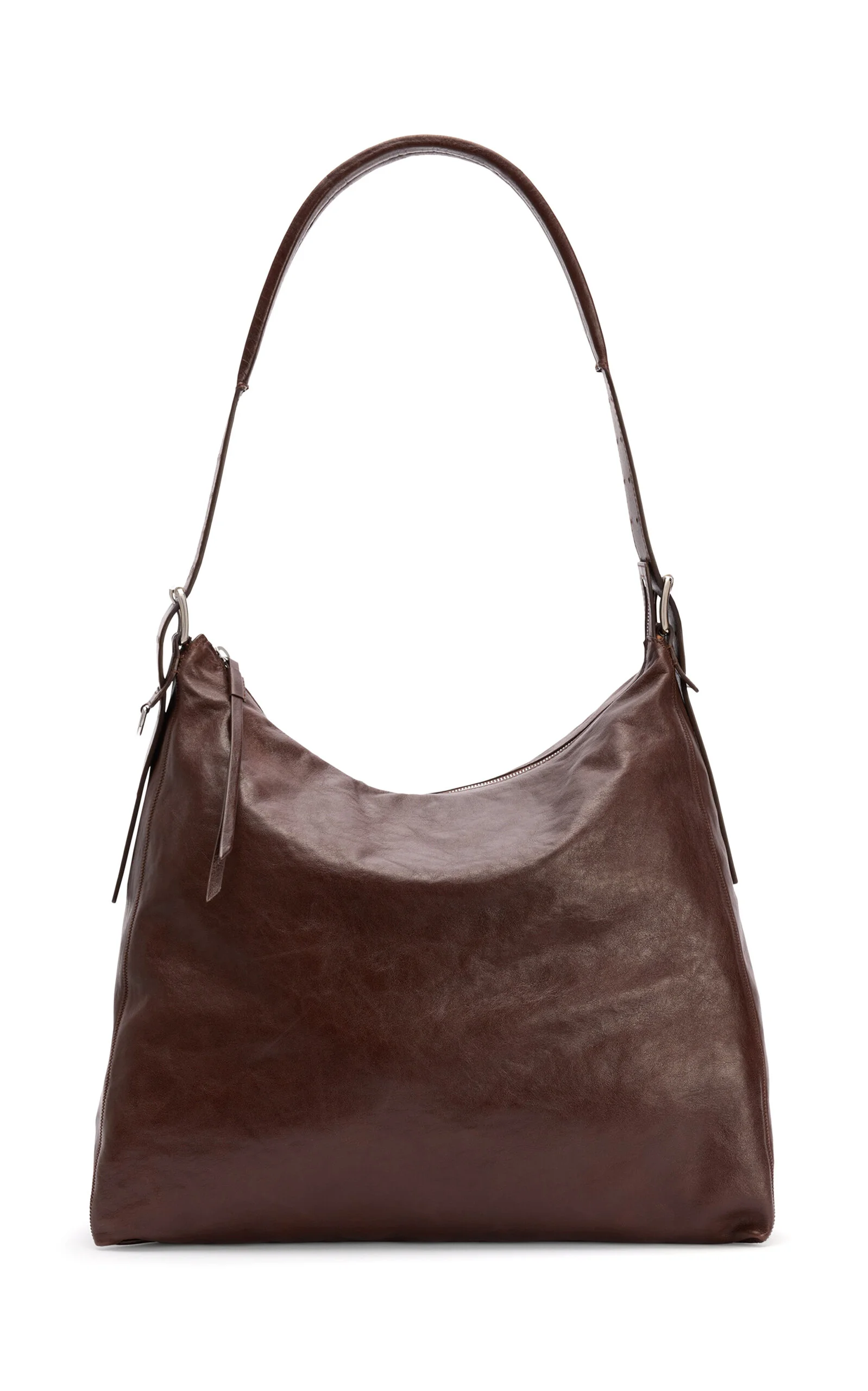 Helmed by Christophe Lemaire and Sarah-Linh Tran, the Lemaire brand creates a modular wardrobe through timeless Parisian design — pieces are meant to be paired effortlessly across seasons and collections. Leather goods and accessories are made by local artisans with novel approaches to age-old techniques. This iconic Lemaire style is reinvented this season in a thin and shiny leather with an elegant, shiny finish. The classic hobo silhouette features an adjustable strap with stitched padding, for added comfort and versatility. Its unlined sides keep its structure light and very supple, with a reinforcement lining securing the bottom. Double-pin buckles and D-Rings add to its utilitarian charm. PRODUCT DETAILS - Zip fastening - Composition: 100% calfskin leather - Designer color: Espresso - Made in Spain