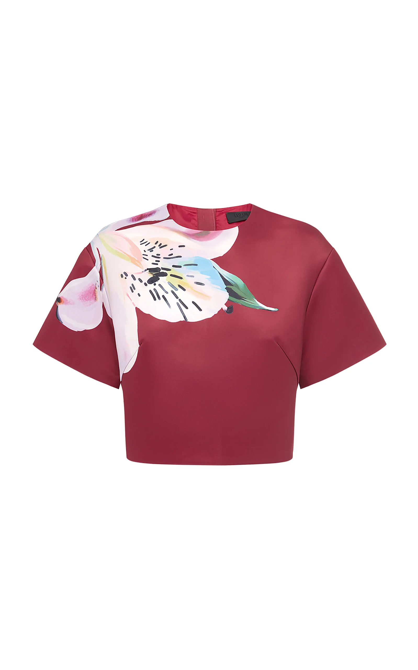 PRODUCT DETAILS - Short sleeve, cropped hem, boxy fit - Concealed zip fastening - Lined - Composition: 100% Polyester/ Lining: 55% Polyester 45% Viscose - Color: Lily Print in Burgundy - Dry clean only - Pre-Fall '25