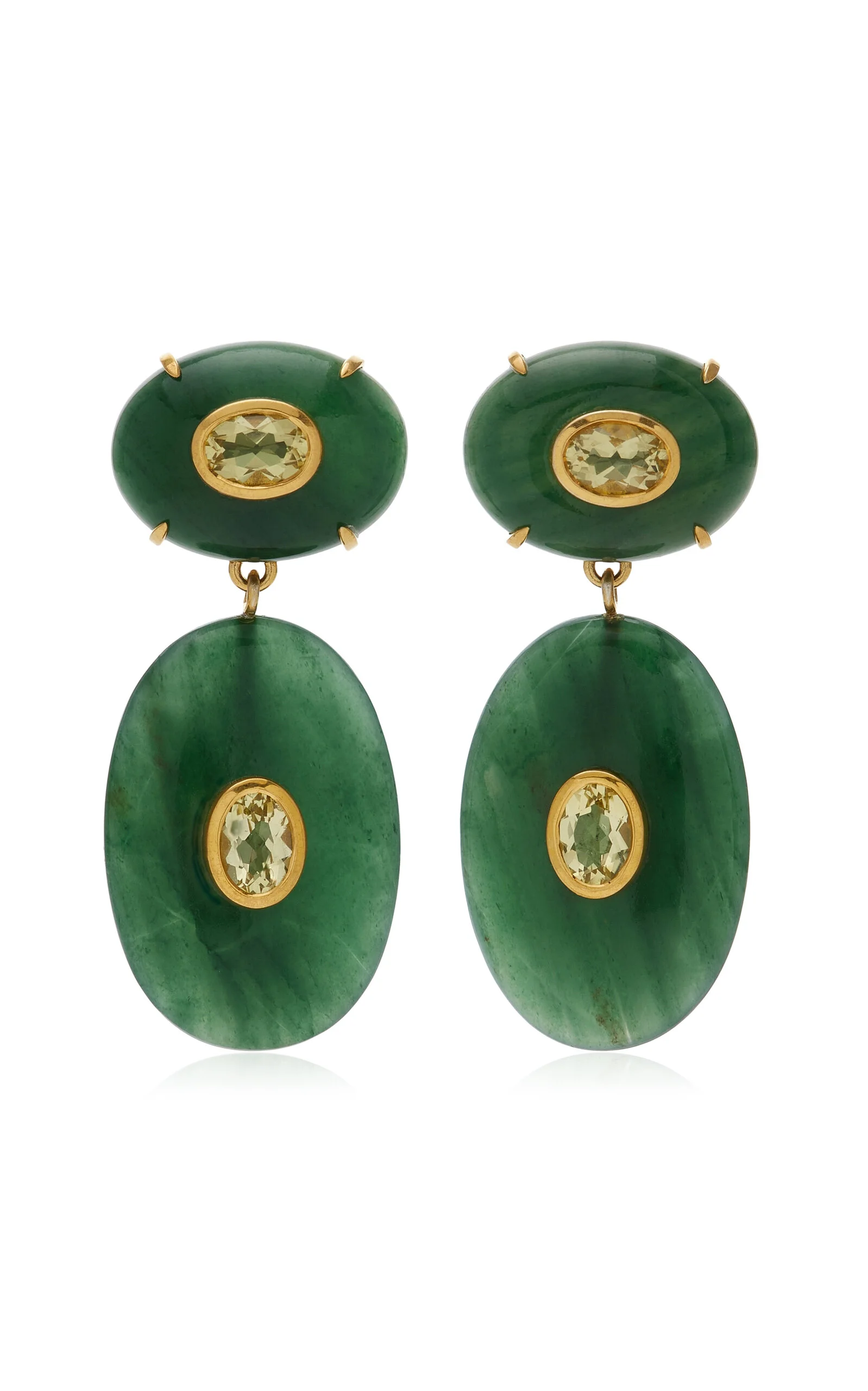 Using an eclectic mix of found materials, Lizzie Fortunato creates statement jewelry imbued with a warm optimism. This season's lineup offers jolts of uplifting color that can easily be dressed up or down. PRODUCT DETAILS - Green jade stone double drop earrings inlaid with lemon quartz semiprecious stones, Green jade, lemon quartz - Post - Composition: Green jade, lemon quartz - Made in the India