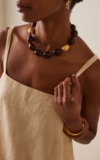 Using an eclectic mix of found materials, Lizzie Fortunato creates statement jewelry imbued with a warm optimism. This season's lineup offers jolts of uplifting color that can easily be dressed up or down. Dark brown handmade ceramic beaded collar with brushed gold-plated brass bead accents and closure PRODUCT DETAILS - Button lock fastening - Composition: handmade ceramic, brushed gold-plated brass - Made in the USA