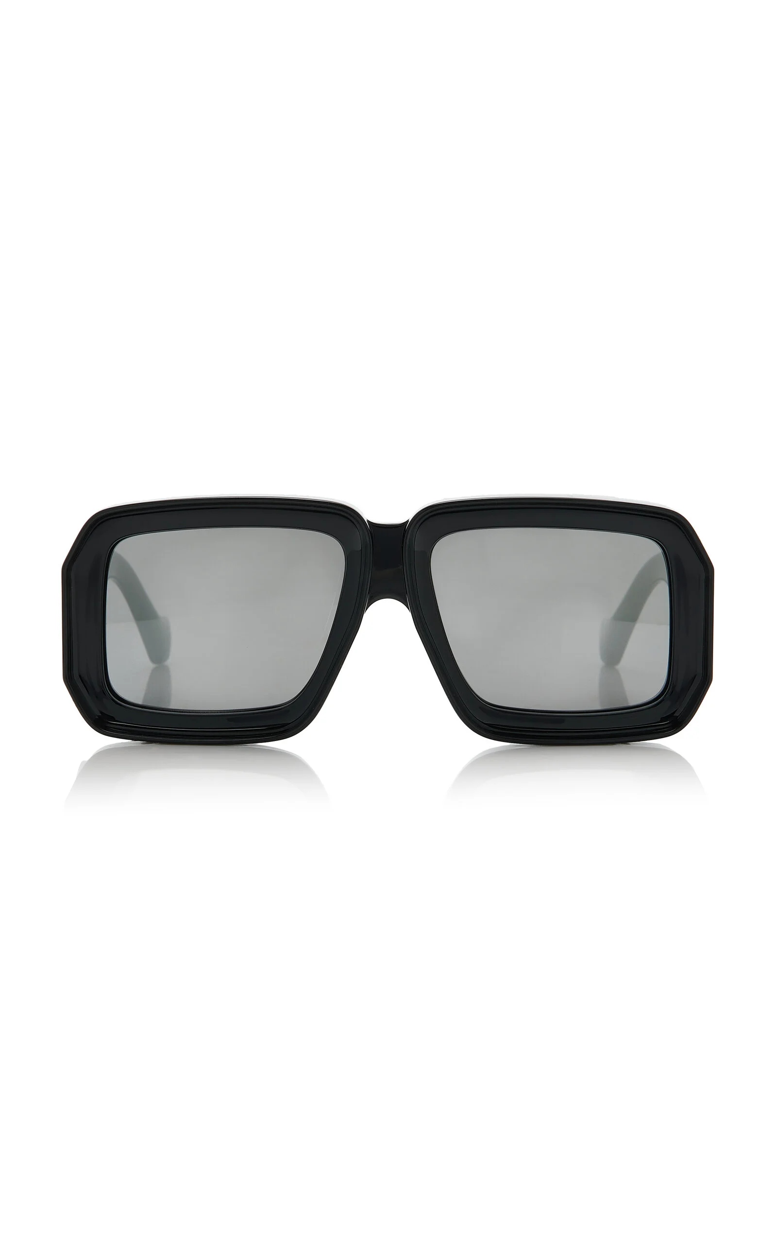 Loewe's sunglasses are defined by their contemporary silhouettes. Made in Italy, the vintage-inspired frames are crafted from the highest quality materials and add effortless glamour to any look. This season's 'Paula's Ibiza' pair features oversized mask frames made from chunky acetate set with smoke-grey mirrored lenses. PRODUCT DETAILS - Composition: acetate - 100% UVA/ UVB protection - Designer color: Shiny Black/ Smoke Mirror - Made in Italy