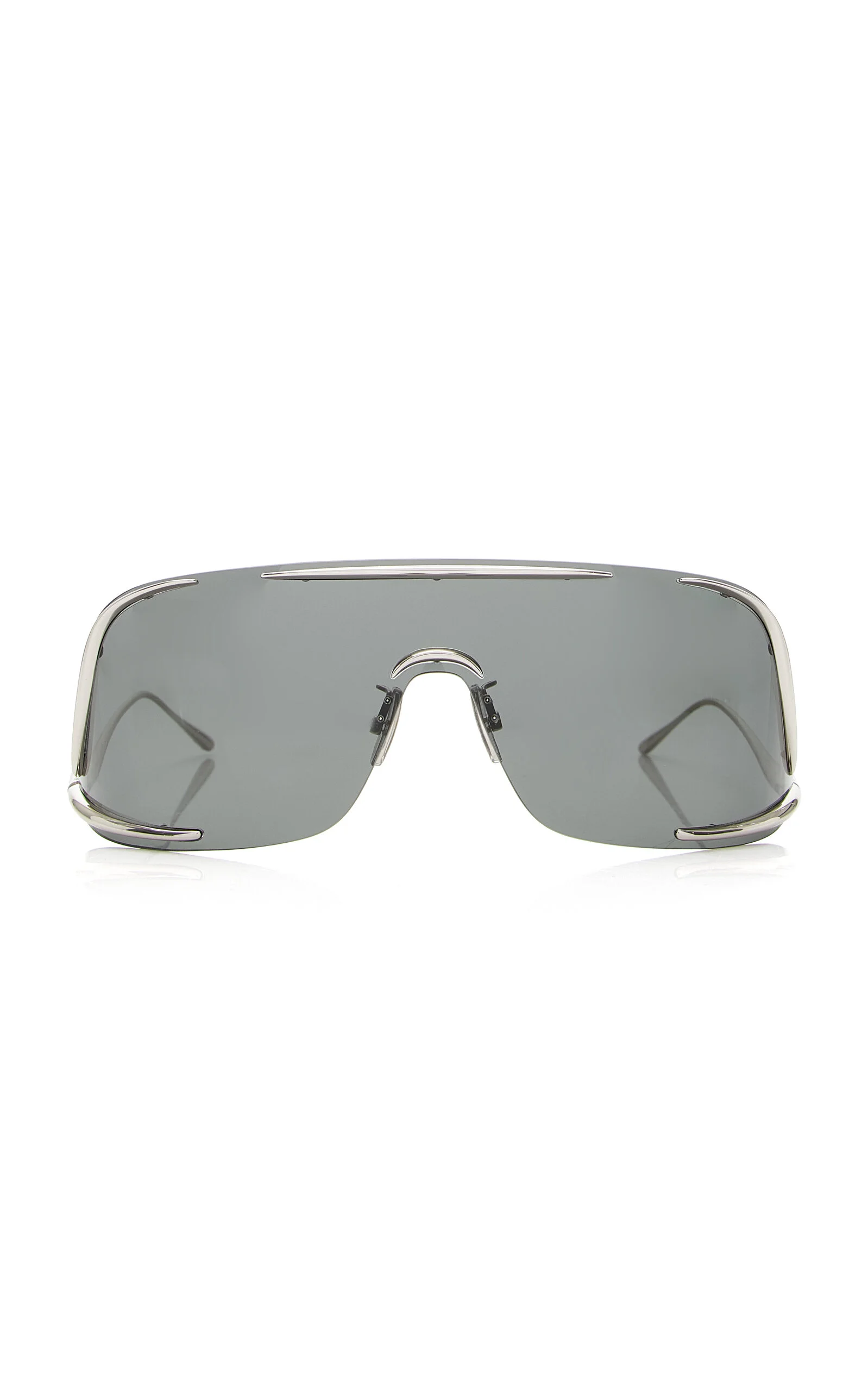 Handcrafted from the highest quality materials, Loewe's eyewear blends vintage inspiration with modern sensibilities. The 'Shield' sunglasses have are made from lightweight metal with smoke grey lenses. PRODUCT DETAILS - Composition: metal - Designer color: Shiny Palladium/ Smoke - 100% UVA/ UVB protection - Made in Italy