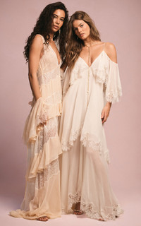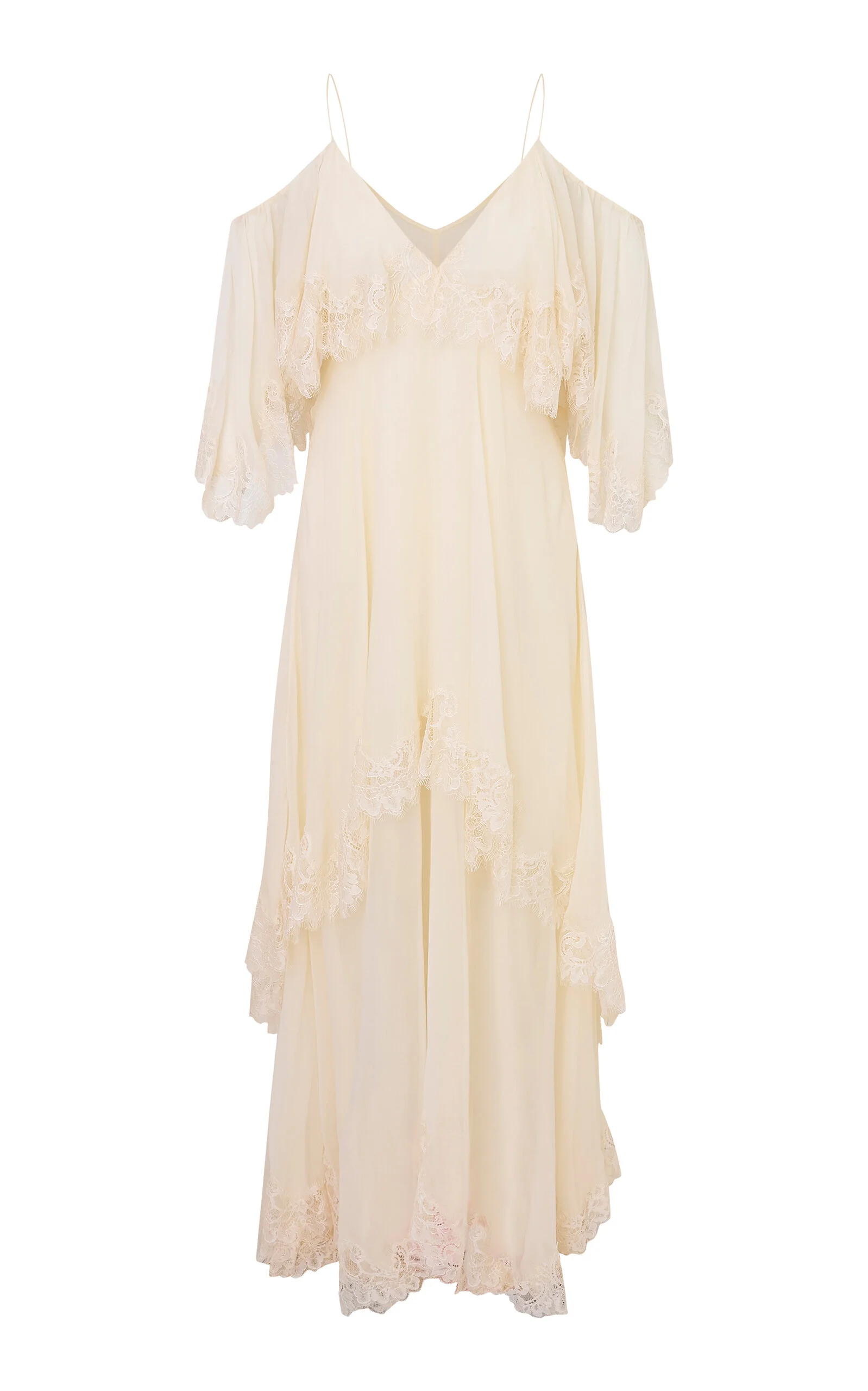 PRODUCT DETAILS - Pre-Fall 2025 - Regular fit, deep V neckline with petite straps, cold-shoulder sleeves with lace leaver hemline, A-line silhouette gown with lace leavers hemline - Unlined - Composition: 100% SILK - Side Seam Zipper - *Dry Clean Only - Made in China