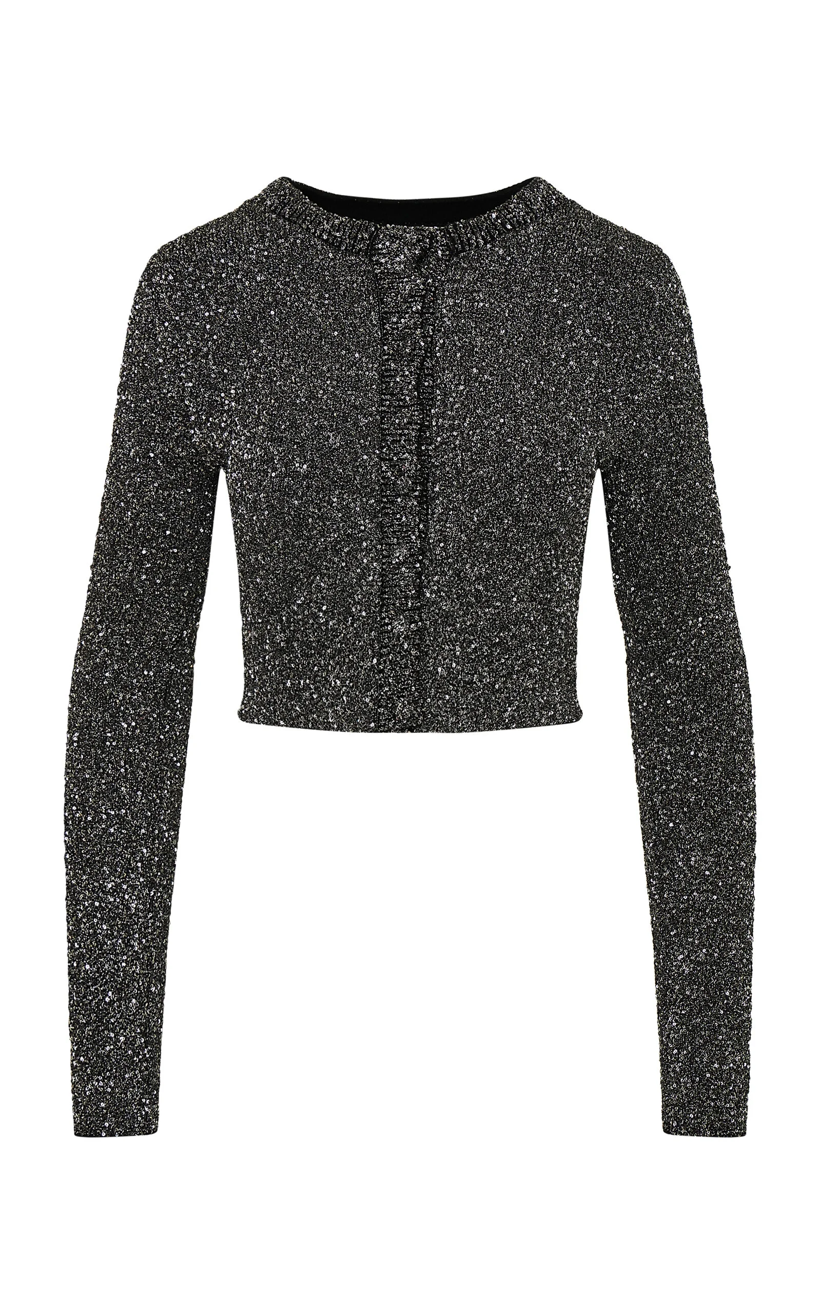 SEQUIN STRETCH CARDIGAN PRODUCT DETAILS - Resort '26 - Slim fit, rounded neckline and long sleeves, crystal embellished throughout - Unlined - Composition: 82% VISCOSE, 18% POLYESTER - Front Button Closure - *Dry clean only - Made in China