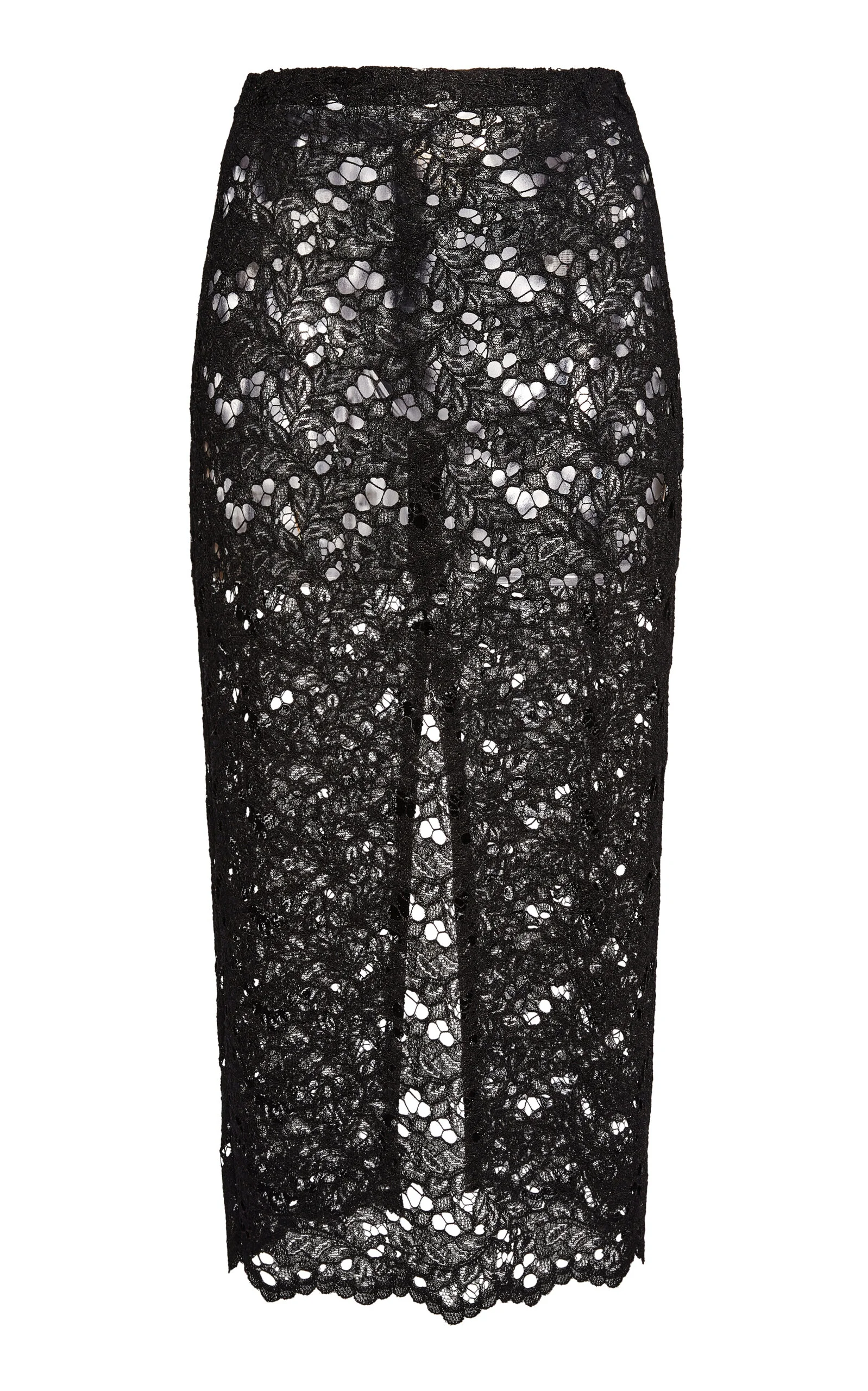 PRODUCT DETAILS - Slim fit, high rise, lace throughout, pencil cut silhouette with lace leavers by the hemline - Zip Fastening Through Back - Unlined - Composition: 36% Pl 64% Rayonne - Color: black - Dry Clean Only - Fall-Winter '25
