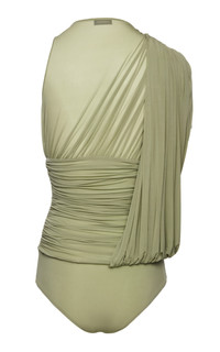 PRODUCT DETAILS - Slim fit, rounded neckline, gathered detailing throughout with an attached sash capelet - Zip Closure Through Back - Partially Lined - Composition: 92% Cupro, 8% Elastane - Color: green - Dry Clean Only - Pre-Fall '25