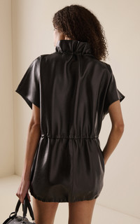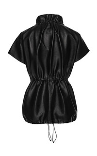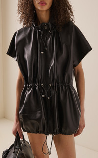 PRODUCT DETAILS - Regular fit, high rise neckline, kimono sleeves, gathered detailing with a drawstring by the waist for a cinched silhouette - Front Button Closure - Fully Lined - Composition: 100% Sheep Leather; Lining 100% Viscose - Color: black - Dry Clean Only - Pre-Fall '25
