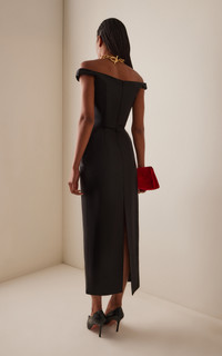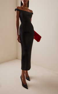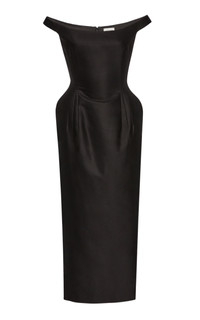PRODUCT DETAILS - Slim fit, off-the-shoulder neckline, corseted bodice, sheath silhouette maxi - Zip Closure Through Back - Fully Lined - Composition: 100% Cotton; Lining 100% Silk - Color: black - Dry Clean Only - Pre-Fall '25