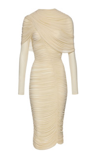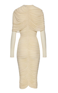 PRODUCT DETAILS - Slim fit, rounded neckline with long sleeves, with an attached capelet by the shoulders, bodycon silhouette midi - Zip Closure Through Back - Lined - Composition: 92% Cupro, 8% Elastane - Color: ivory - Dry Clean Only - Pre-Fall '25