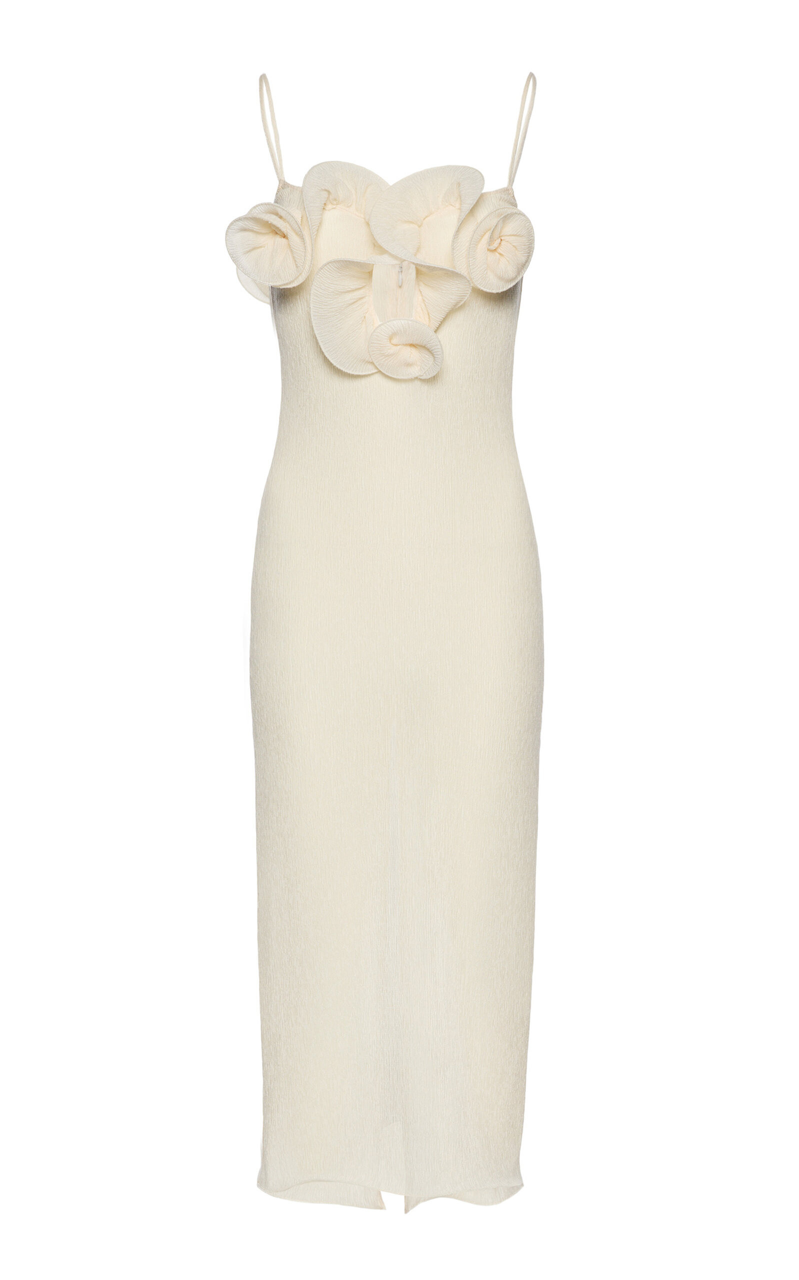 PRODUCT DETAILS - Slim fit, ruffled detailing by the chest and neckline with petite straps, sheath silhouette with slit on front - Zip Closure Through Back - Partially Lined - Composition: 59% Lyocell, 40% Polyester, 1% Elastane - Color: ivory - Dry Clean Only - Pre-Fall '25