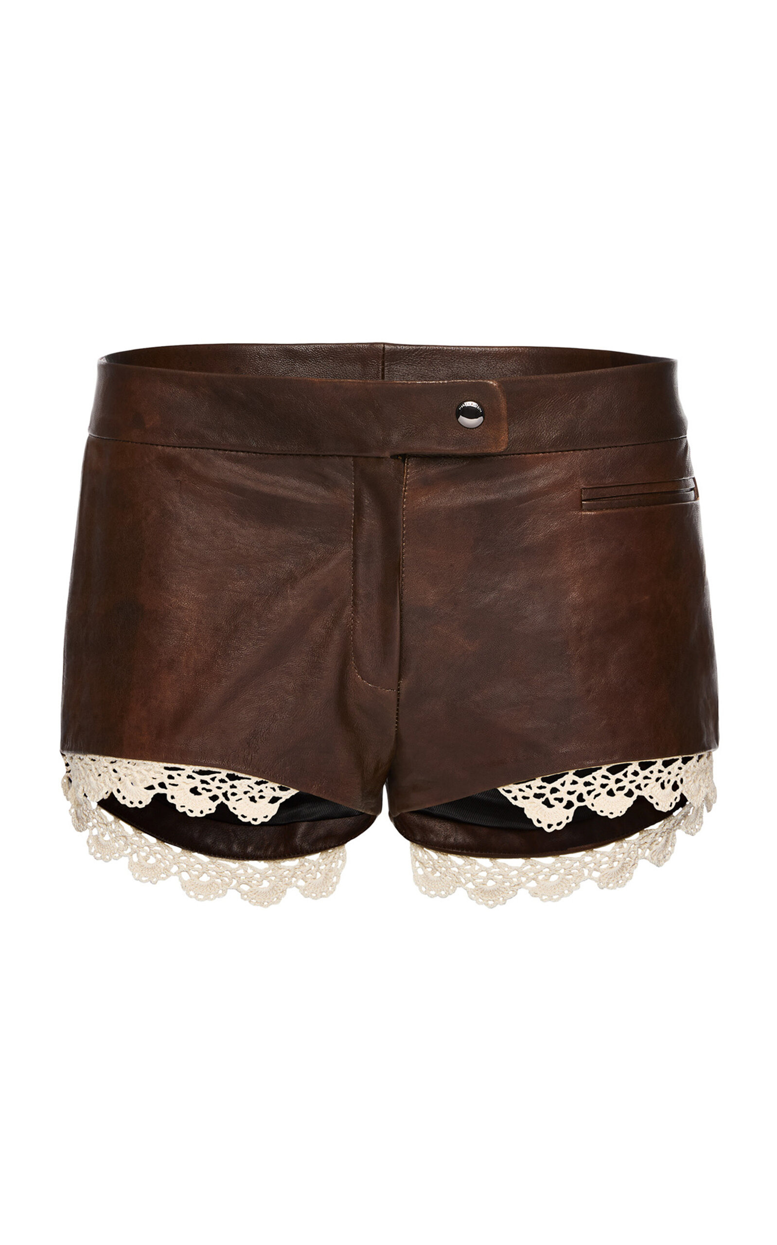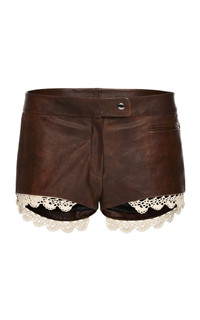 PRODUCT DETAILS - Slim fit, low rise, scallop trims with pockets on both sides - Button and Zip Closure - Fully Lined - Composition: 100% Sheep Leather; Lining 100% Viscose - Color: brown - Dry Clean Only - Pre-Fall '25