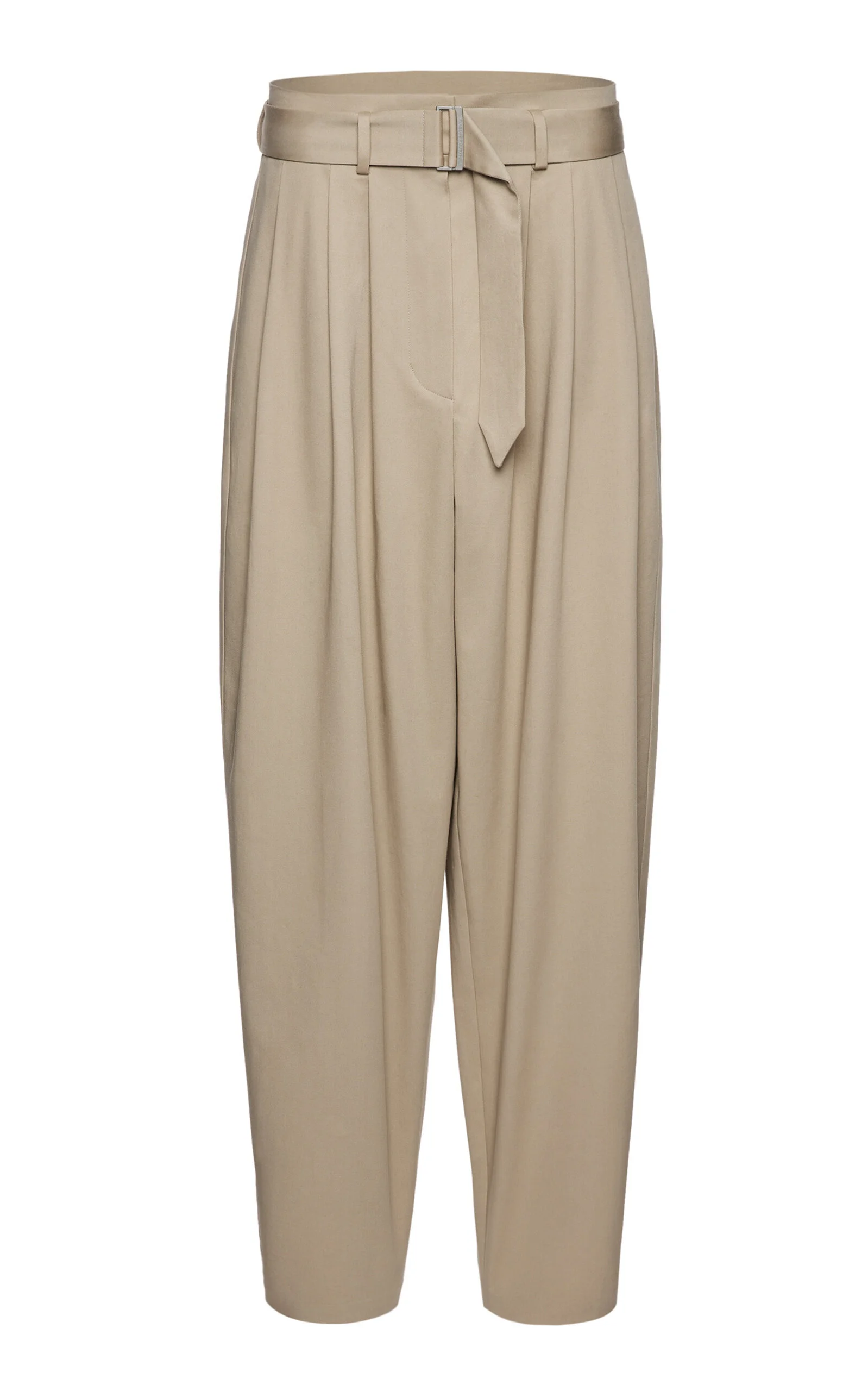 PRODUCT DETAILS - Oversized fit, mid rise, pleated by the waist, relaxed wide leg silhouette, with an attached belt and slash pockets on both sides - Hook and Zip Closure - Lined - Composition: Shell 97% Cotton 3% Elastane. Lining 100% Silk. - Color: nude - Dry Clean Only - Fall-Winter '25